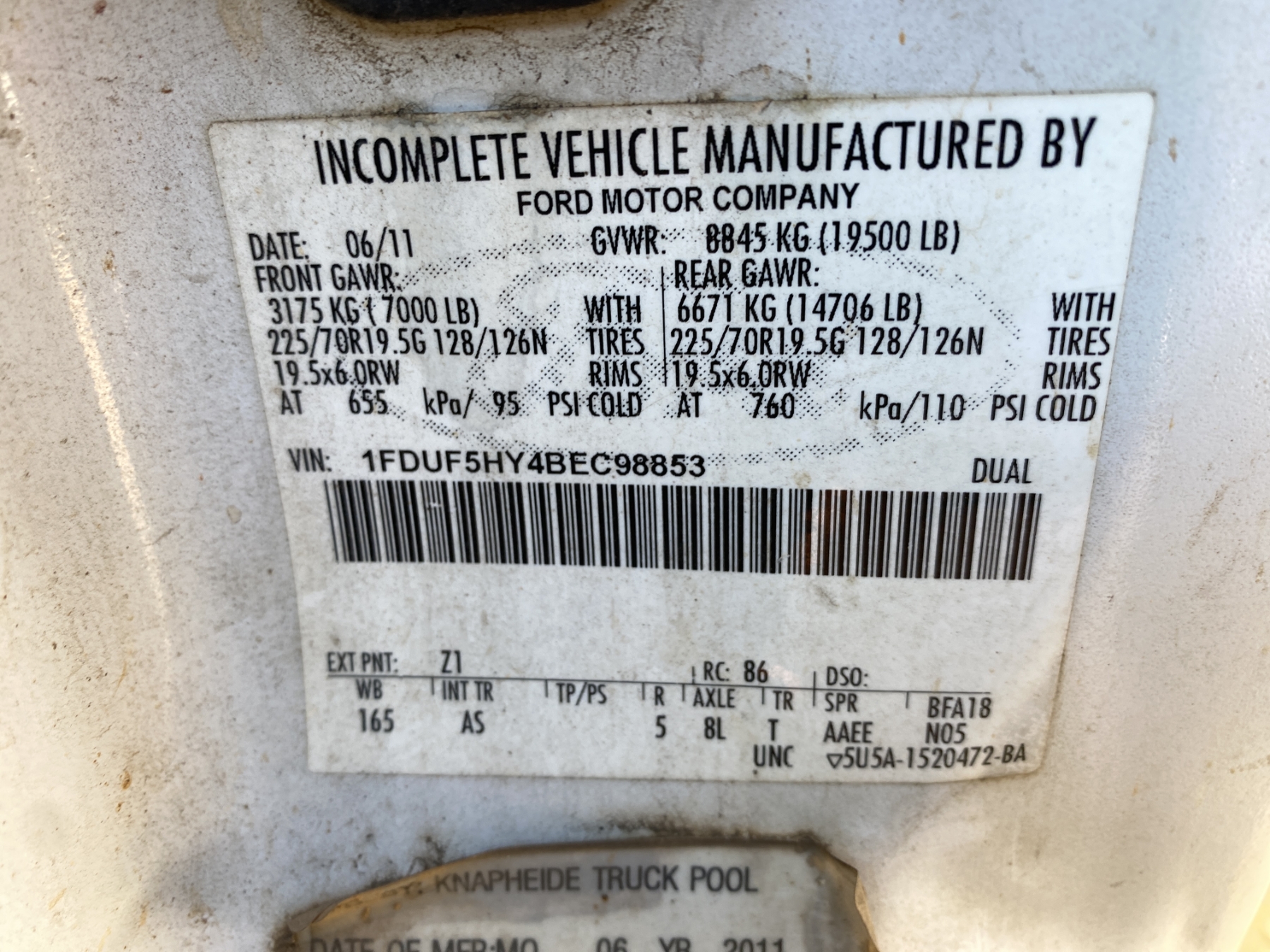 Vehicle ID Number: 1FDUF5HY4BEC98853