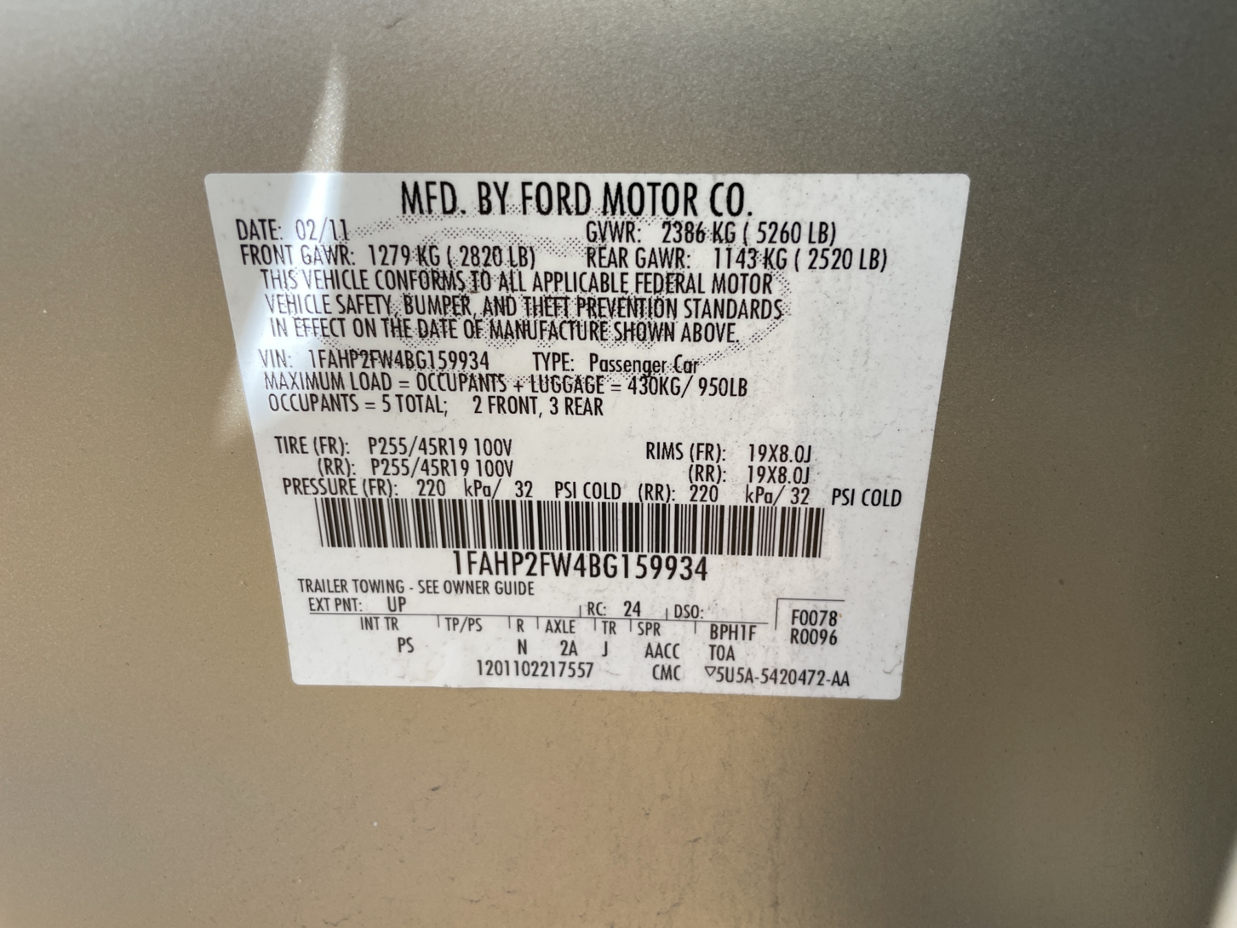 Vehicle ID Number: 1FAHP2FW4BG159934