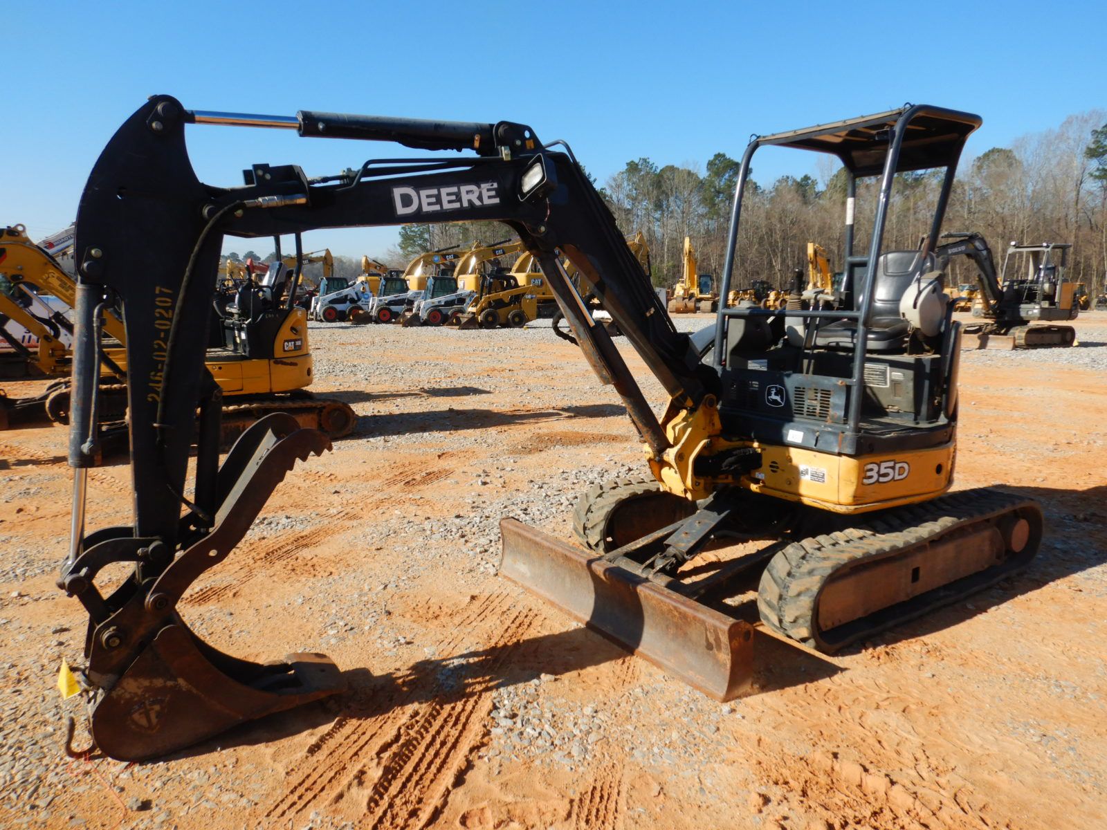 4' 4" stick, 12" bucket, coupler, hyd thumb, aux hyd, blade, rubber tracks, canopy