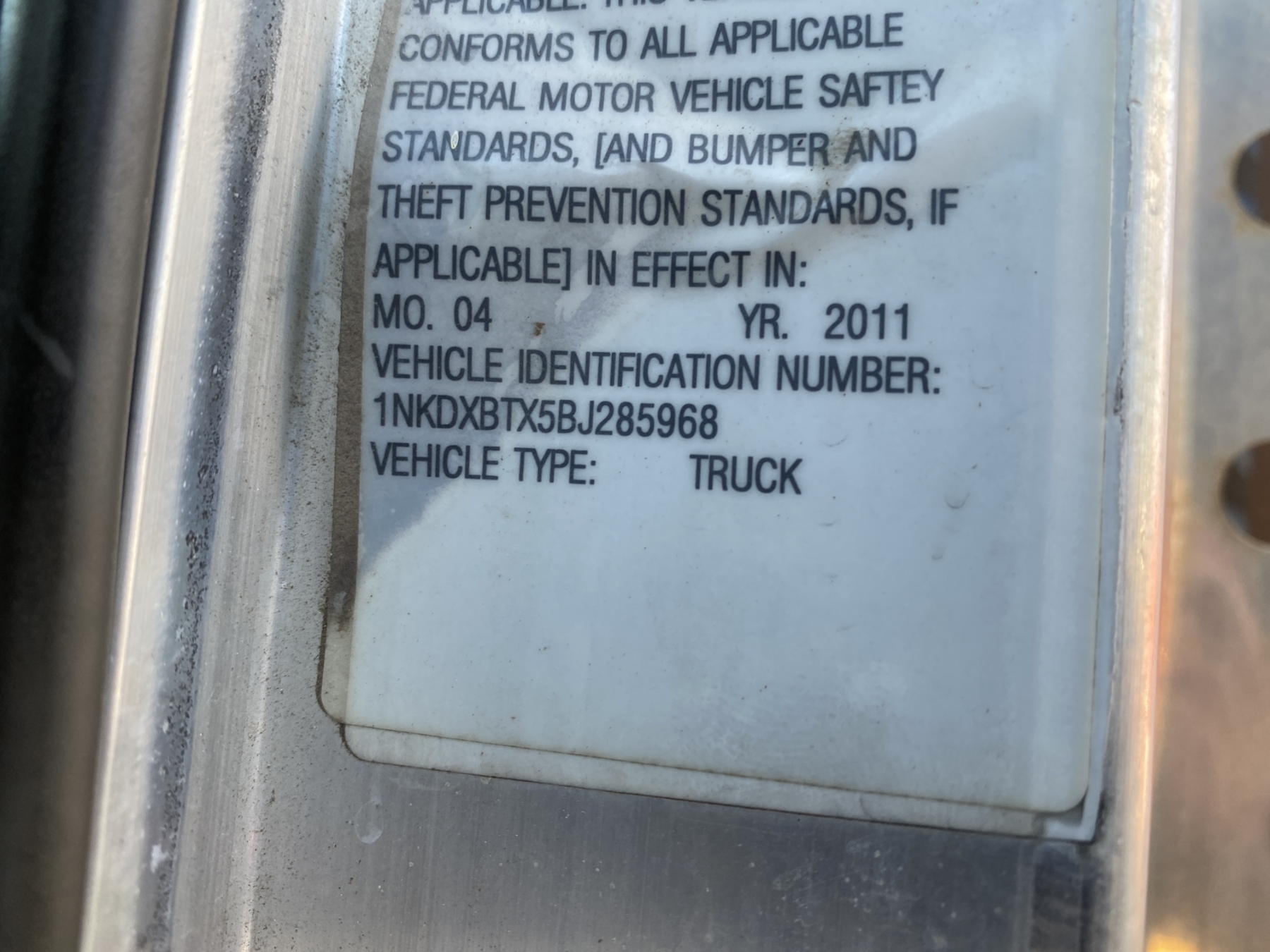 Vehicle ID Number: 1NKDXBTX5BJ285968
