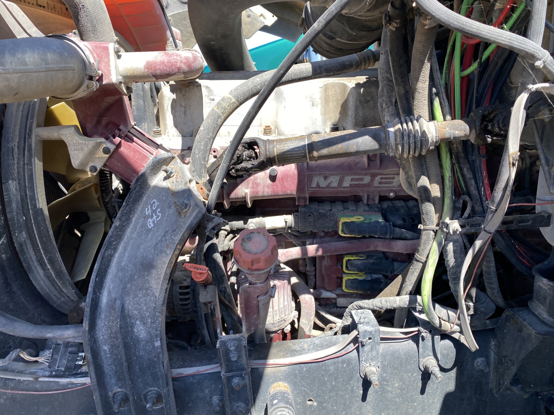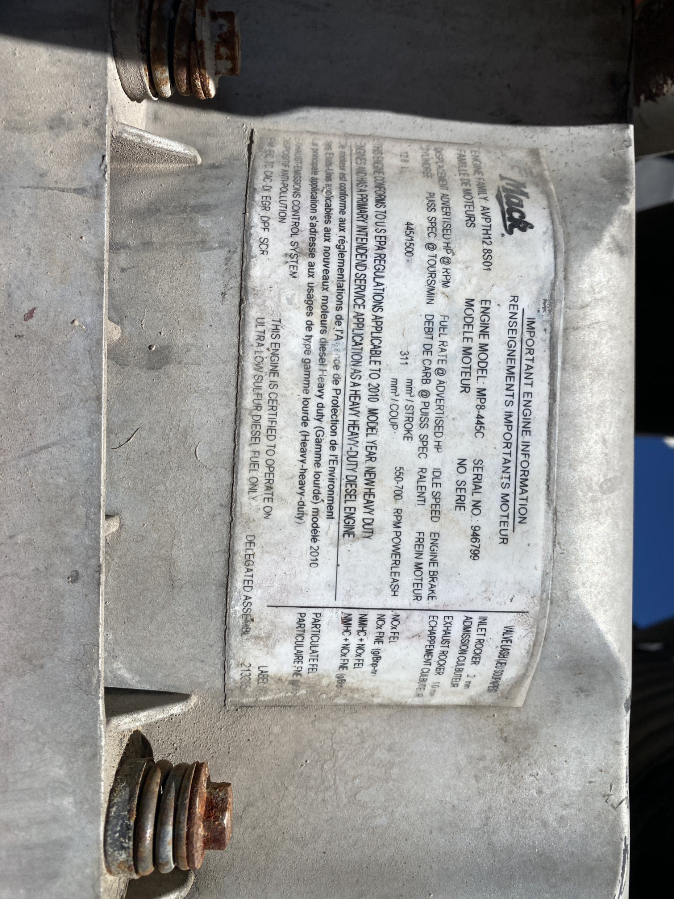 T/A, Mack MP8 engine, 13 speed trans, 38K rears, air ride, 12K front, 230" W/B, wet kit, 11R24.5 tires