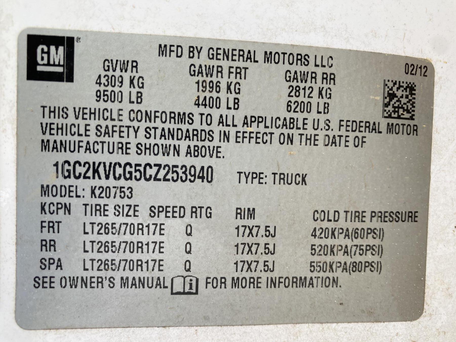 Vehicle ID Number: 1GC2KVCG5CZ253940