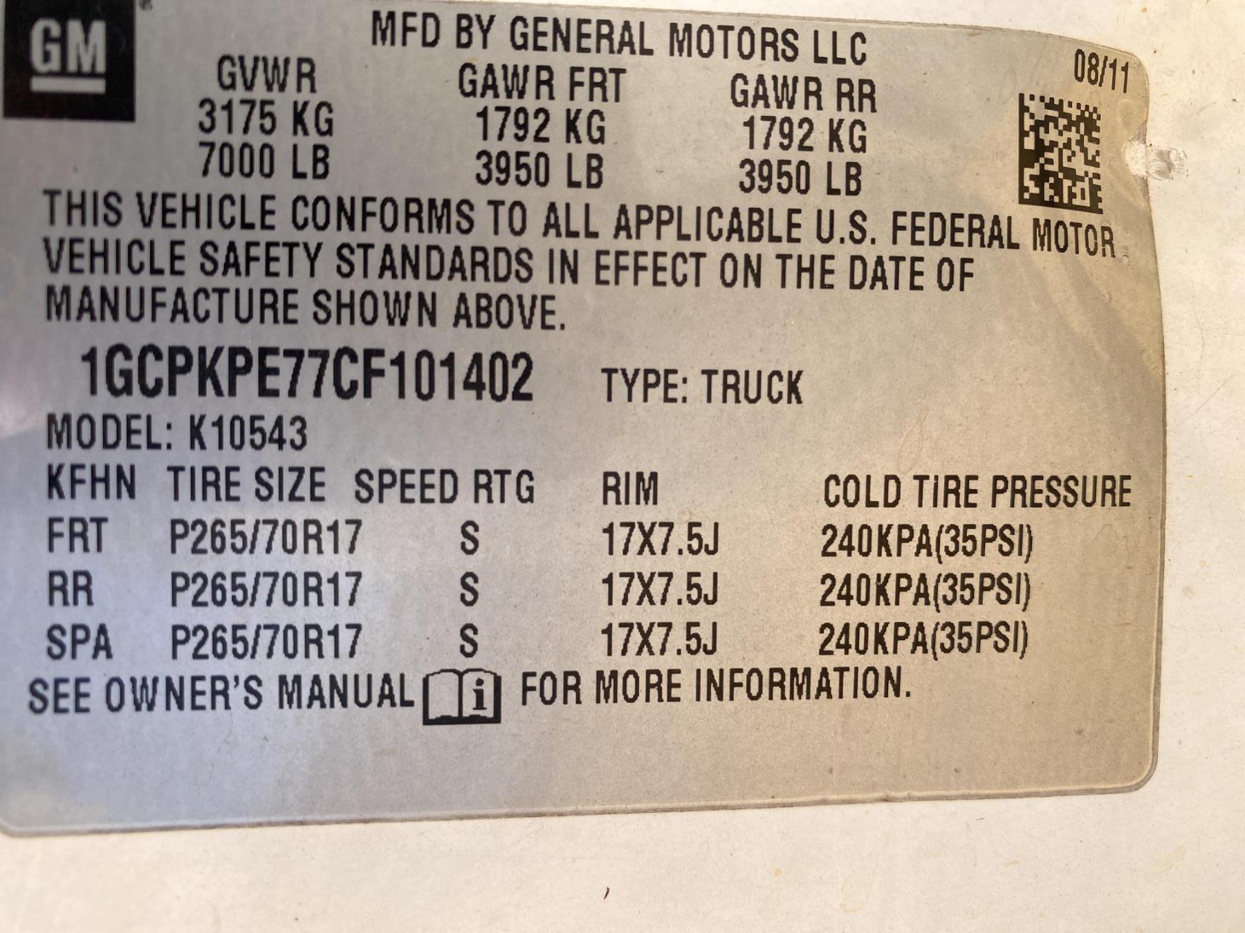 Vehicle ID Number: 1GCPKPE77CF101402