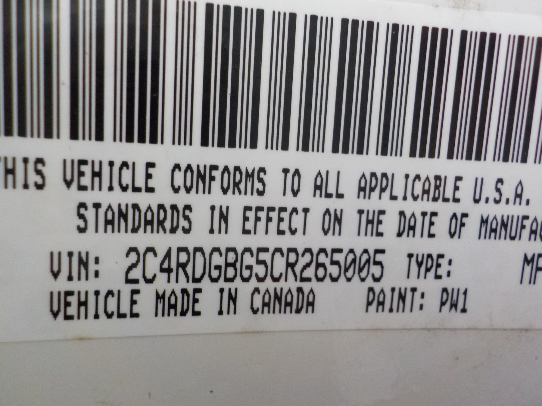 Vehicle ID Number: 2C4RDGBG5CR265005
