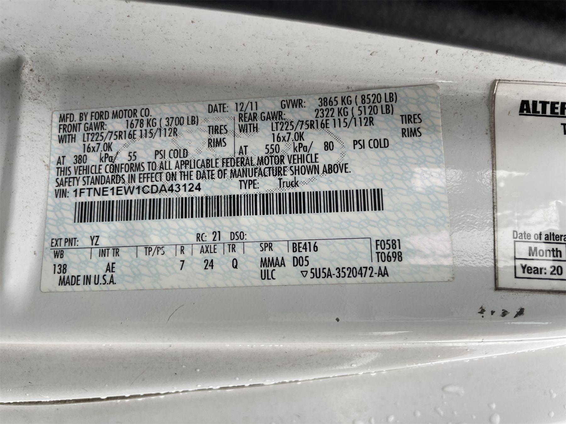 Vehicle ID Number: 1FTNE1EW1CDA43124