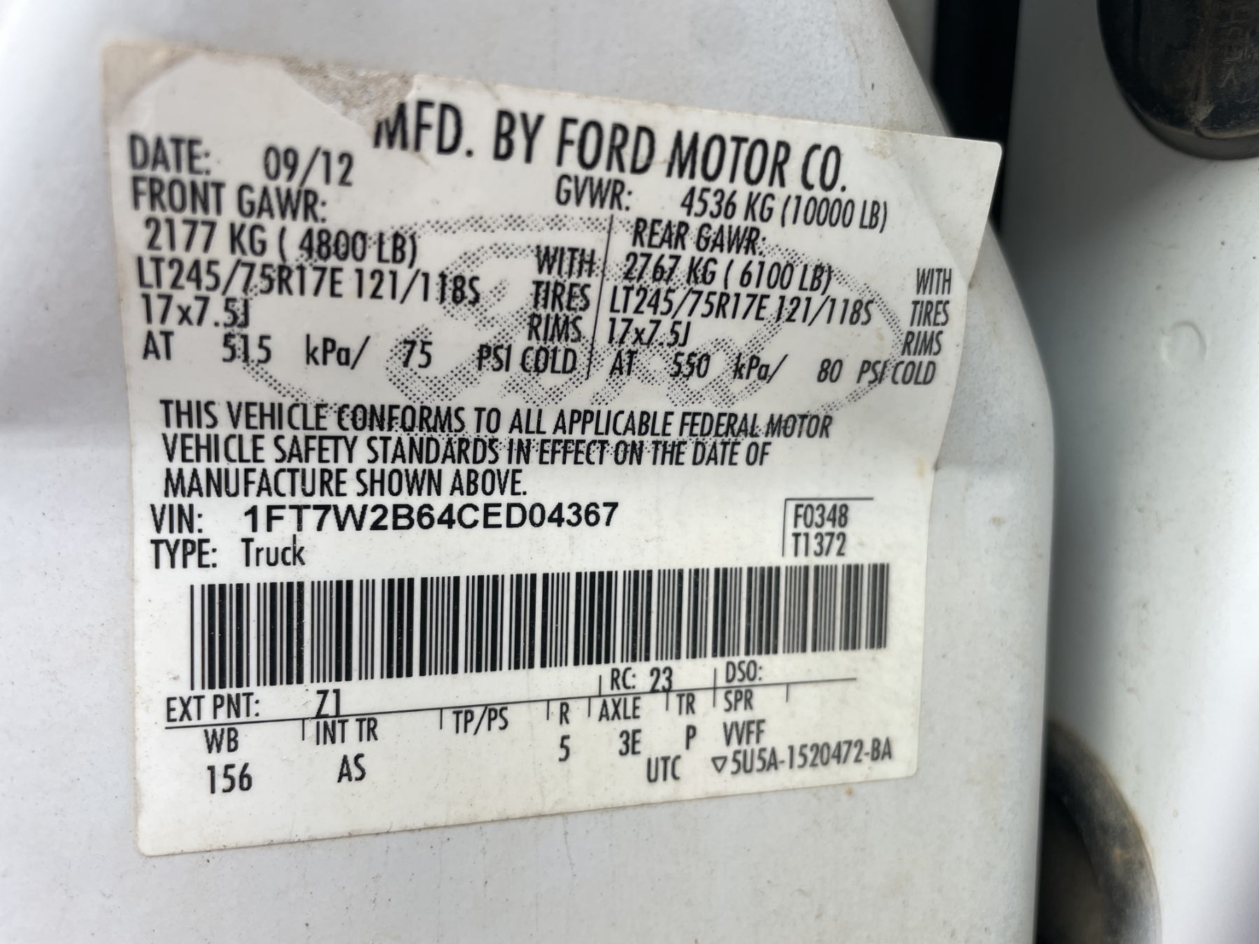 Vehicle ID Number: 1FT7W2B64CED04367