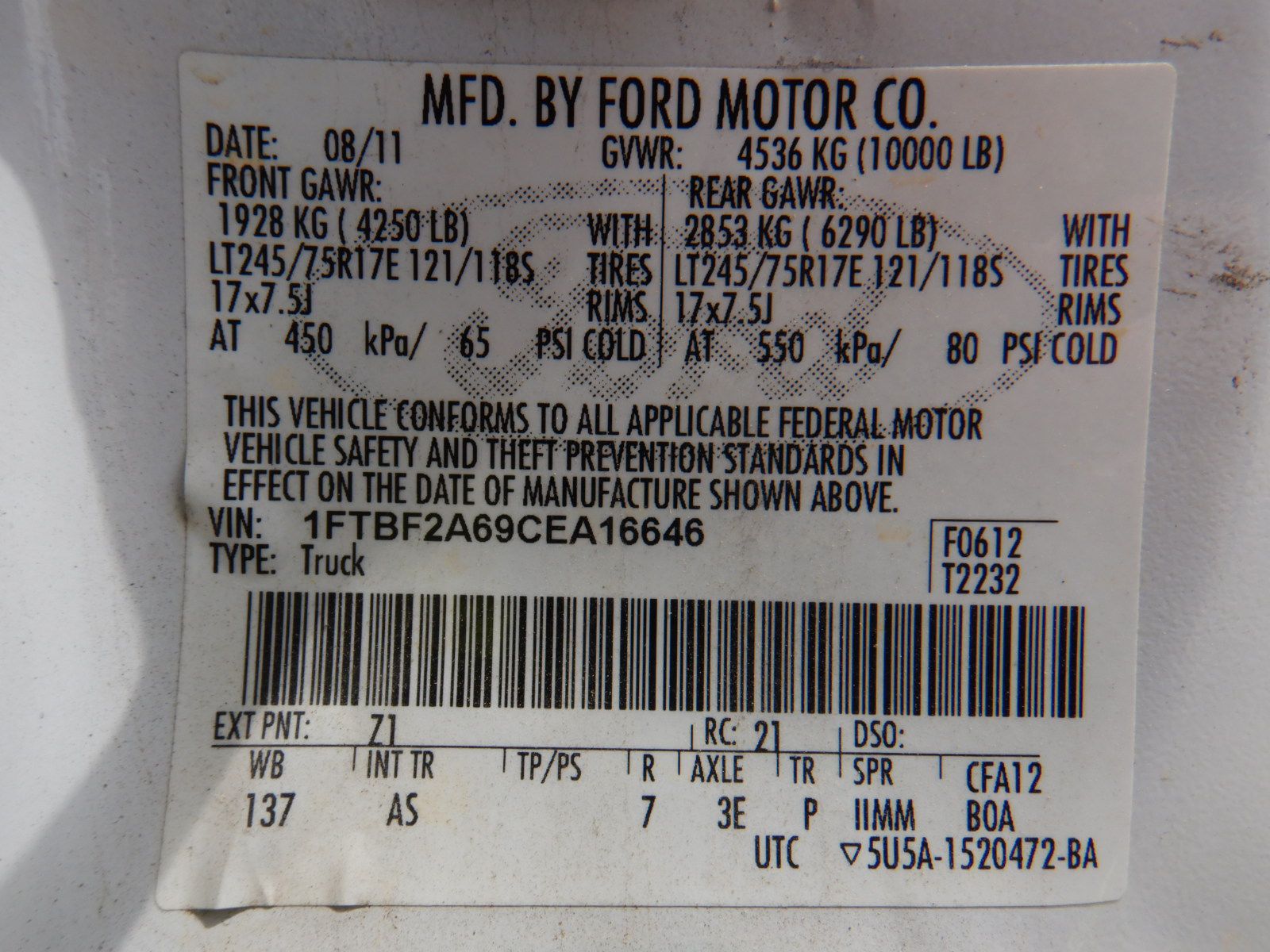 Vehicle ID Number: 1FTBF2A69CEA16646