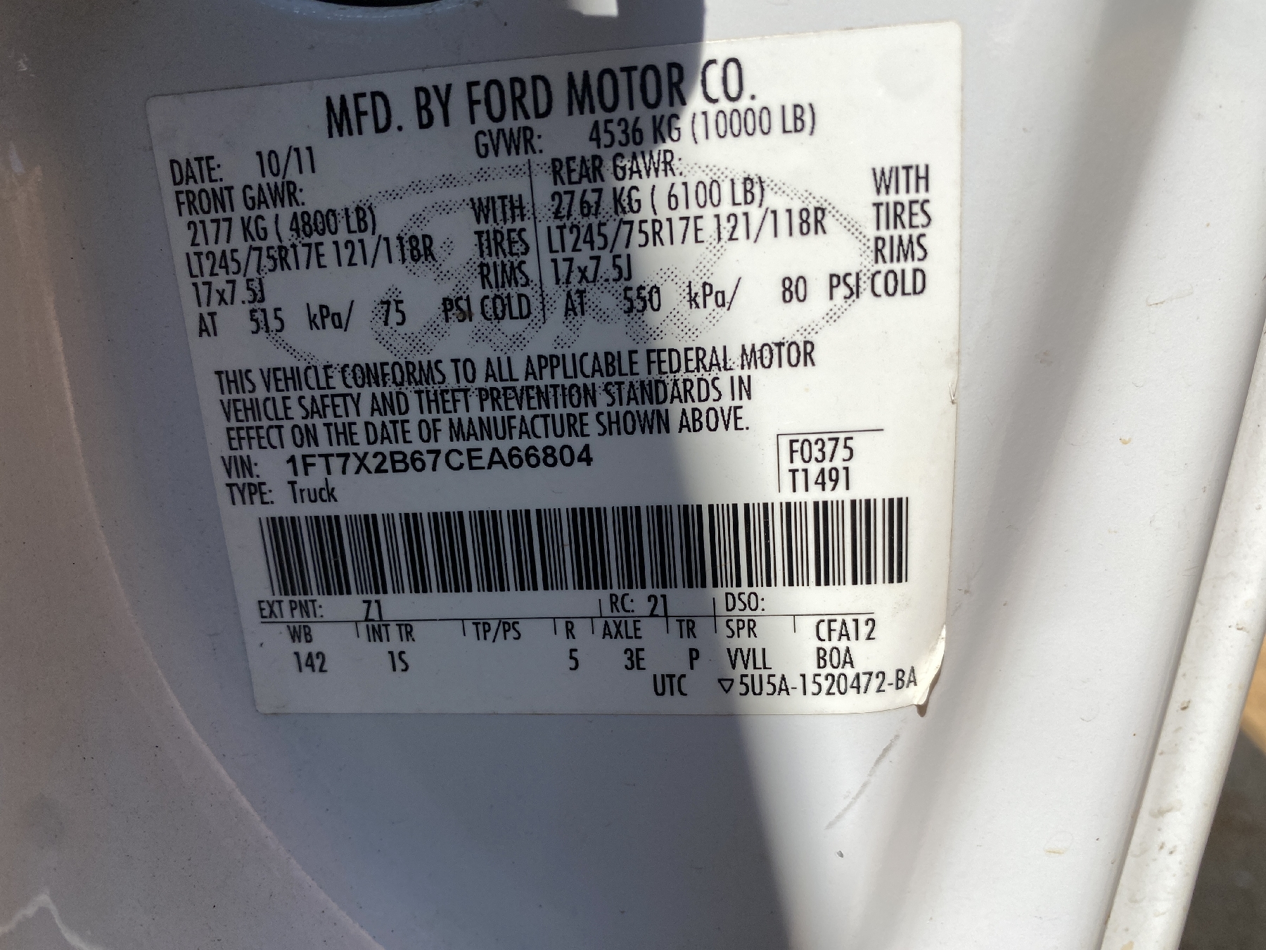 Vehicle ID Number: 1FT7X2B67CEA66804
