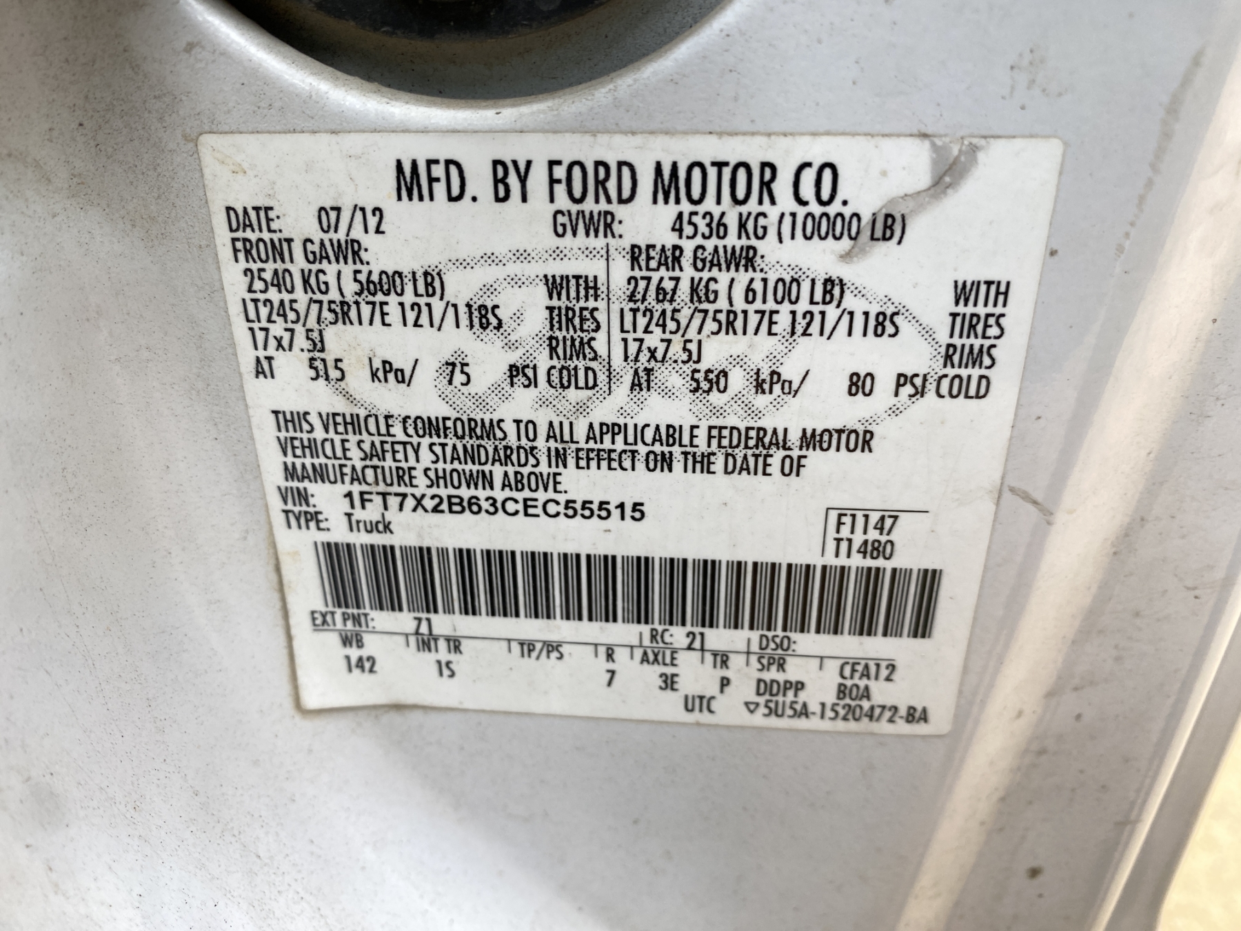 Vehicle ID Number: 1FT7X2B63CEC55515