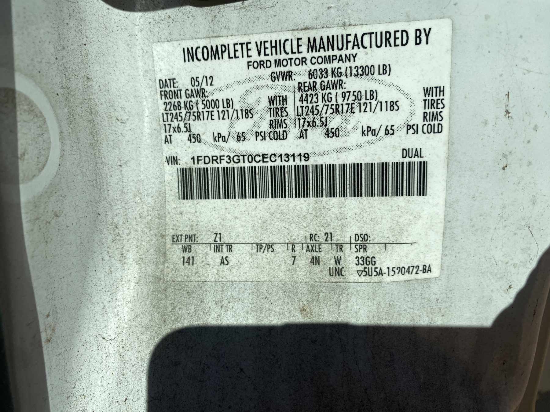 Vehicle ID Number: 1FDRF3GT0CEC13119