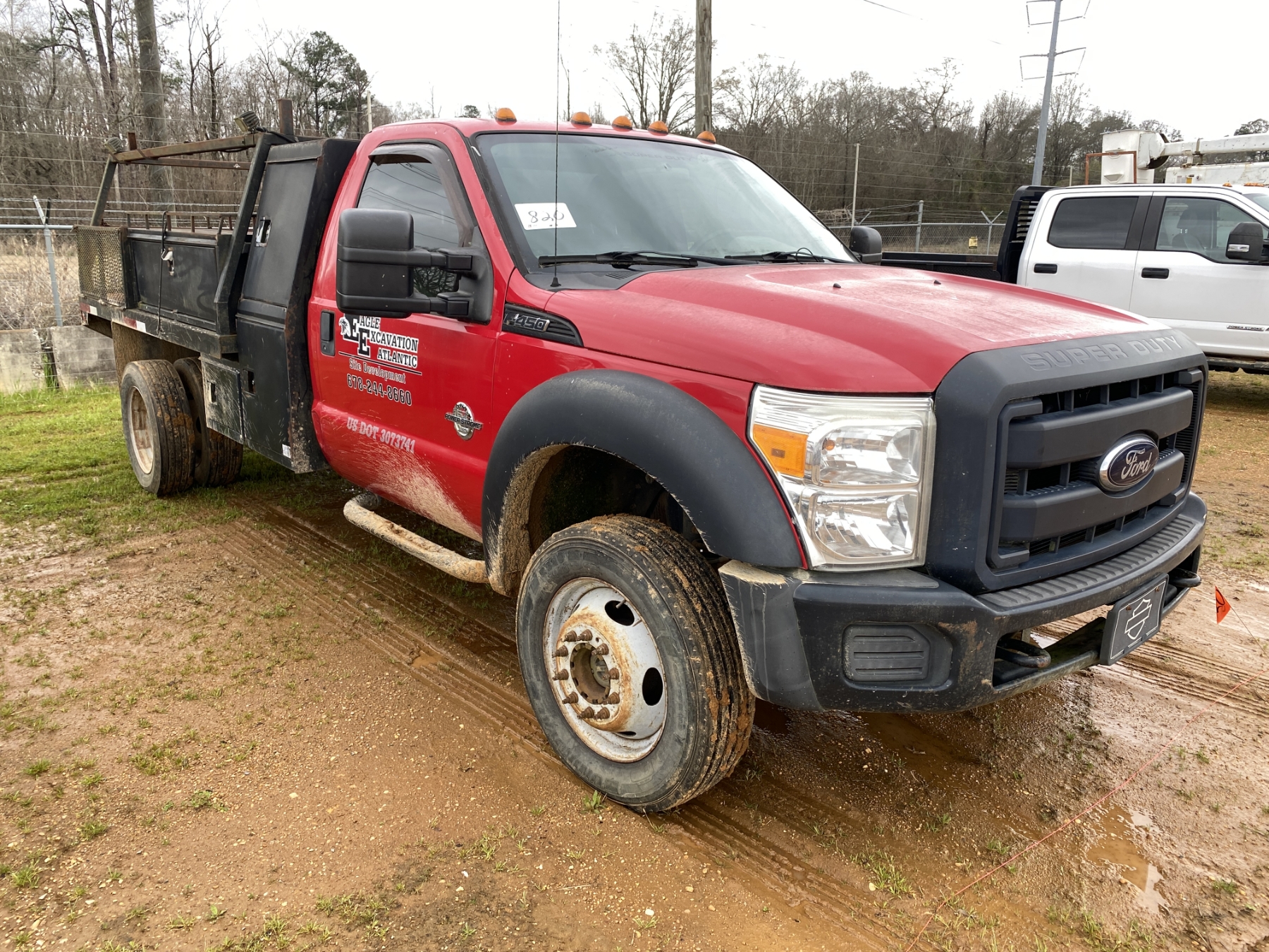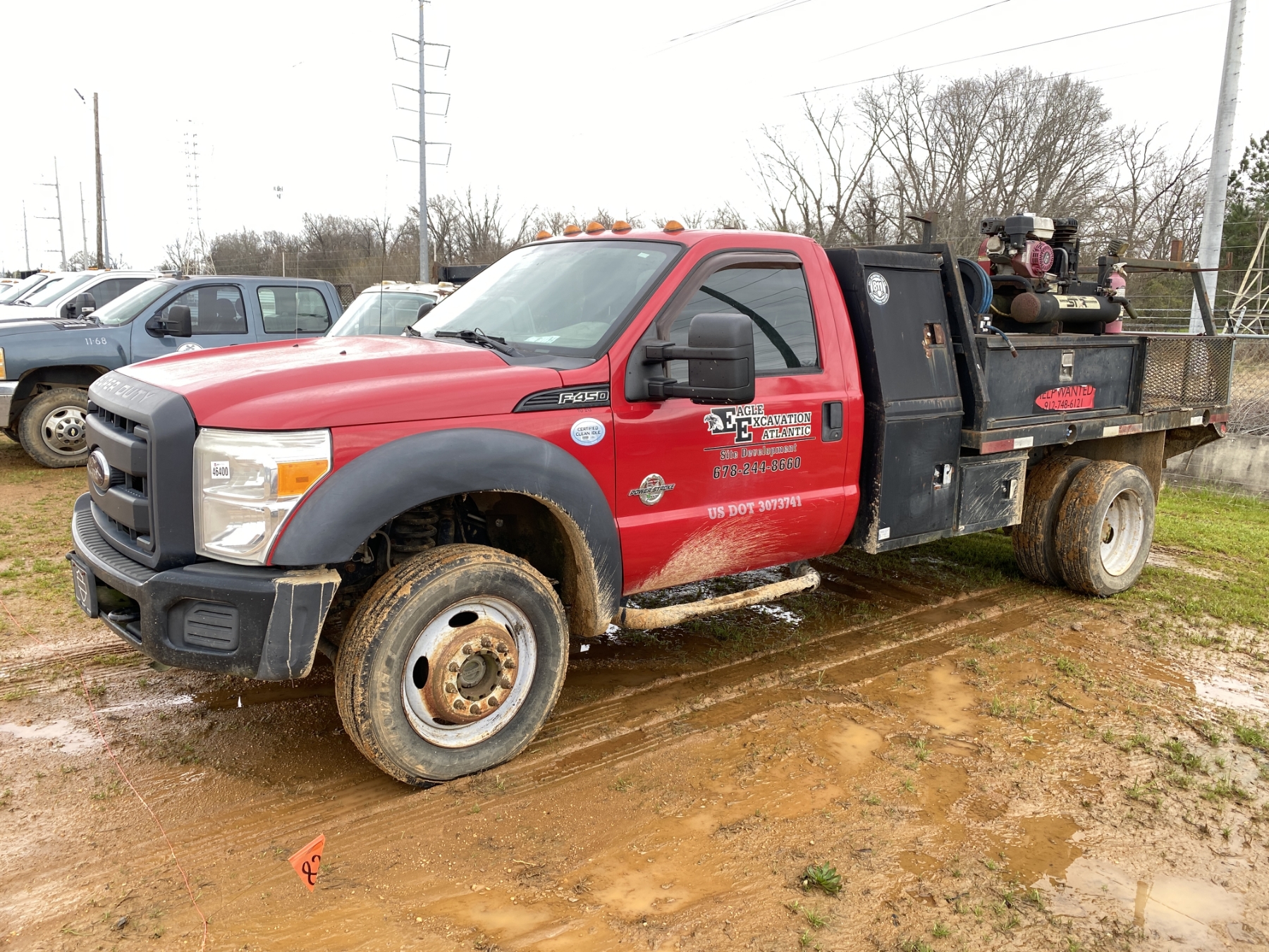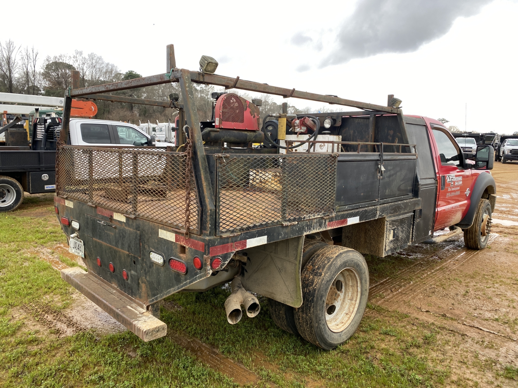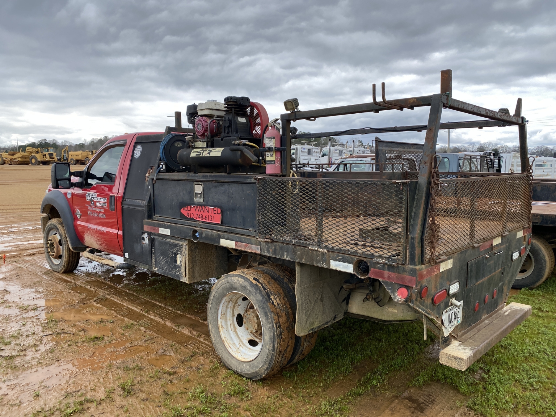 4x4, dually, Power Stroke diesel, A/T, 12' flatbed, air compressor, fuel tank, ladder rack