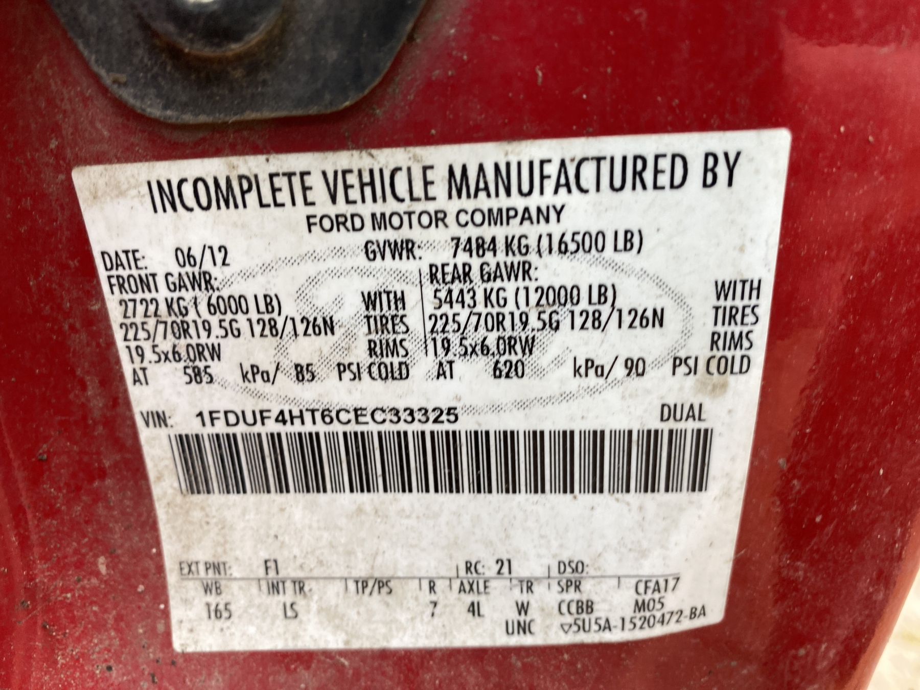 Vehicle ID Number: 1FDUF4HT6CEC33325