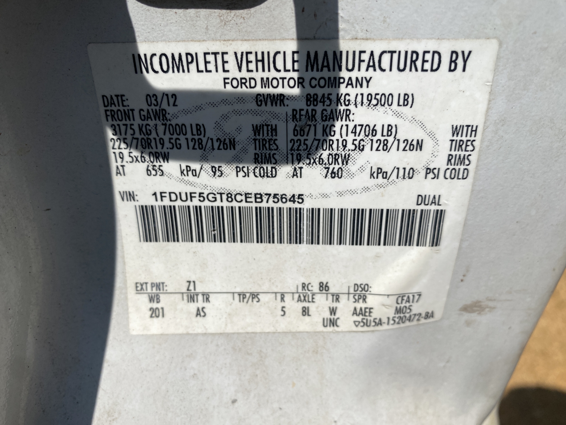 Vehicle ID Number: 1FDUF5GT8CEB75645