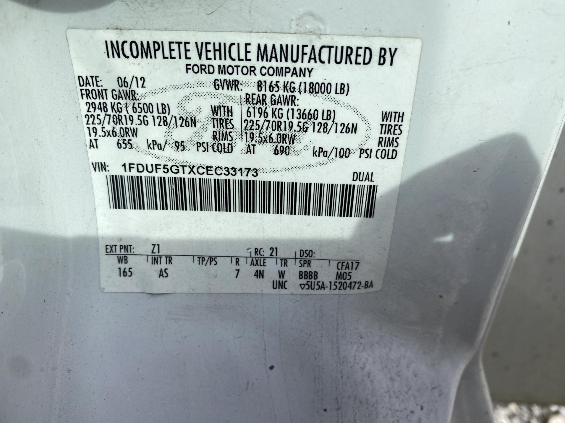 Vehicle ID Number: 1FDUF5GTXCEC33173