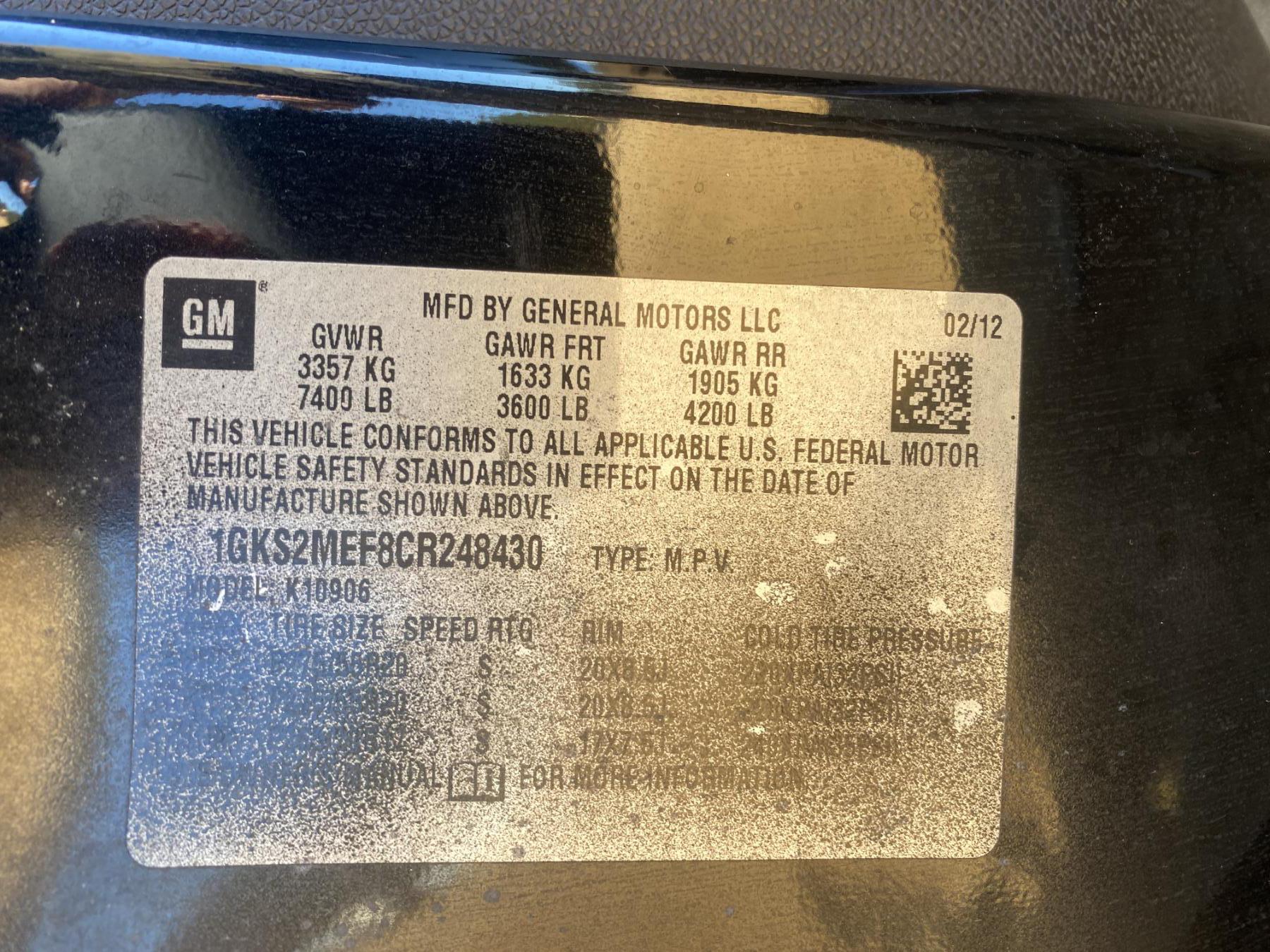 Vehicle ID Number: 1GKS2MEF8CR248430