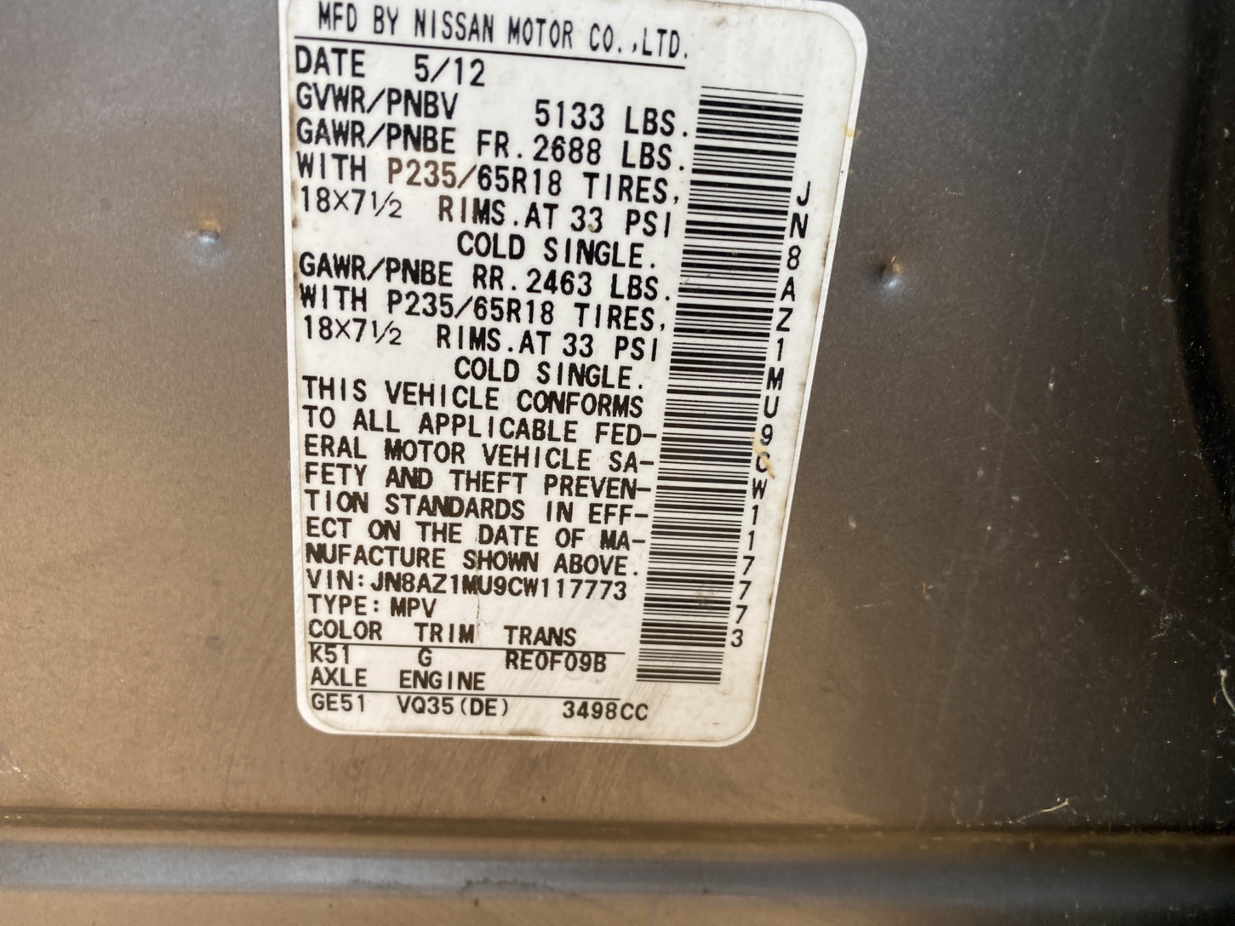 Vehicle ID Number: JN8AZ1MU9CW117773