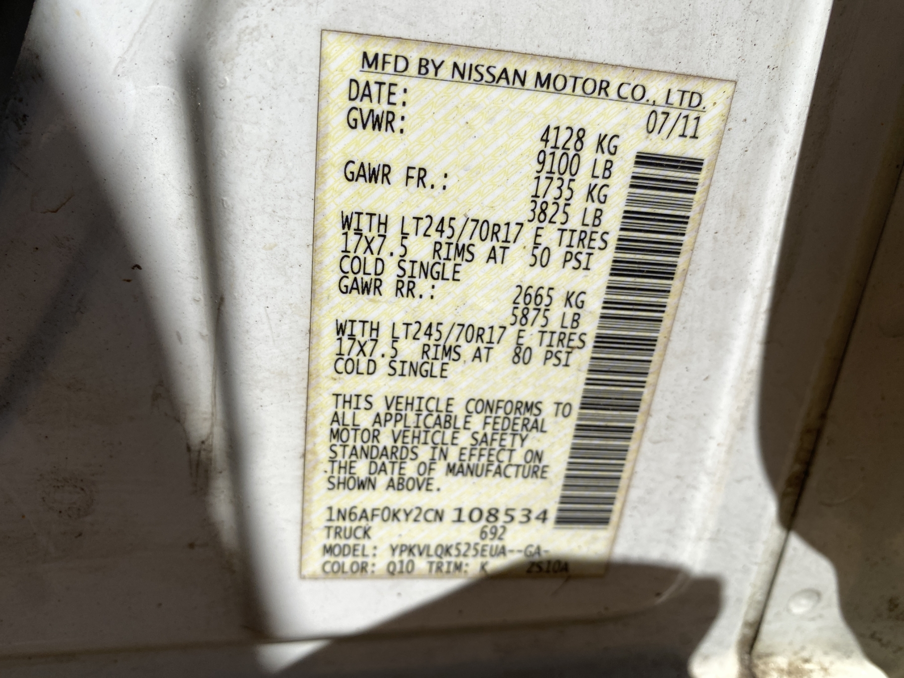 Vehicle ID Number: 1N6AF0KY2CN108534