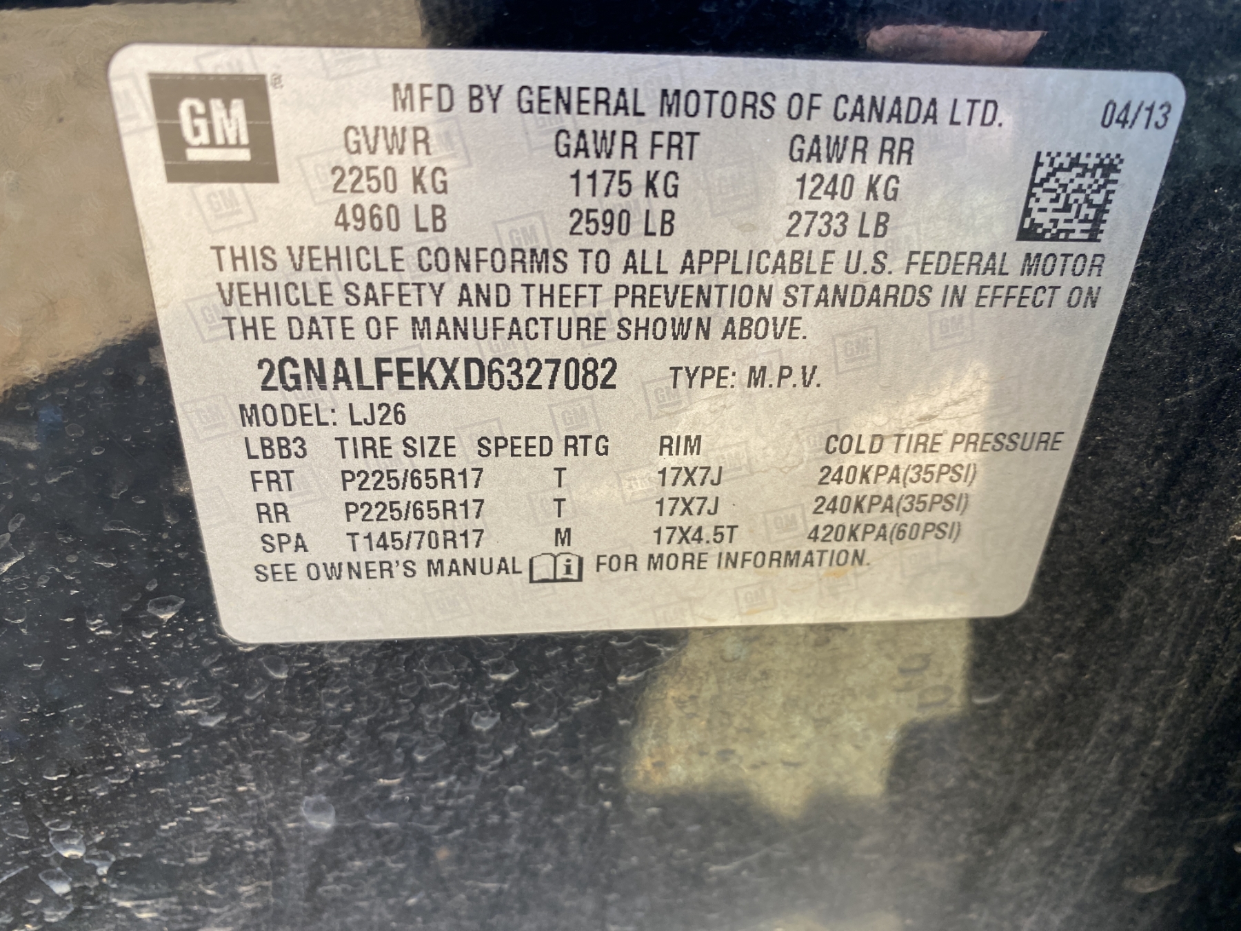 Vehicle ID Number: 2GNALFEKXD6327082