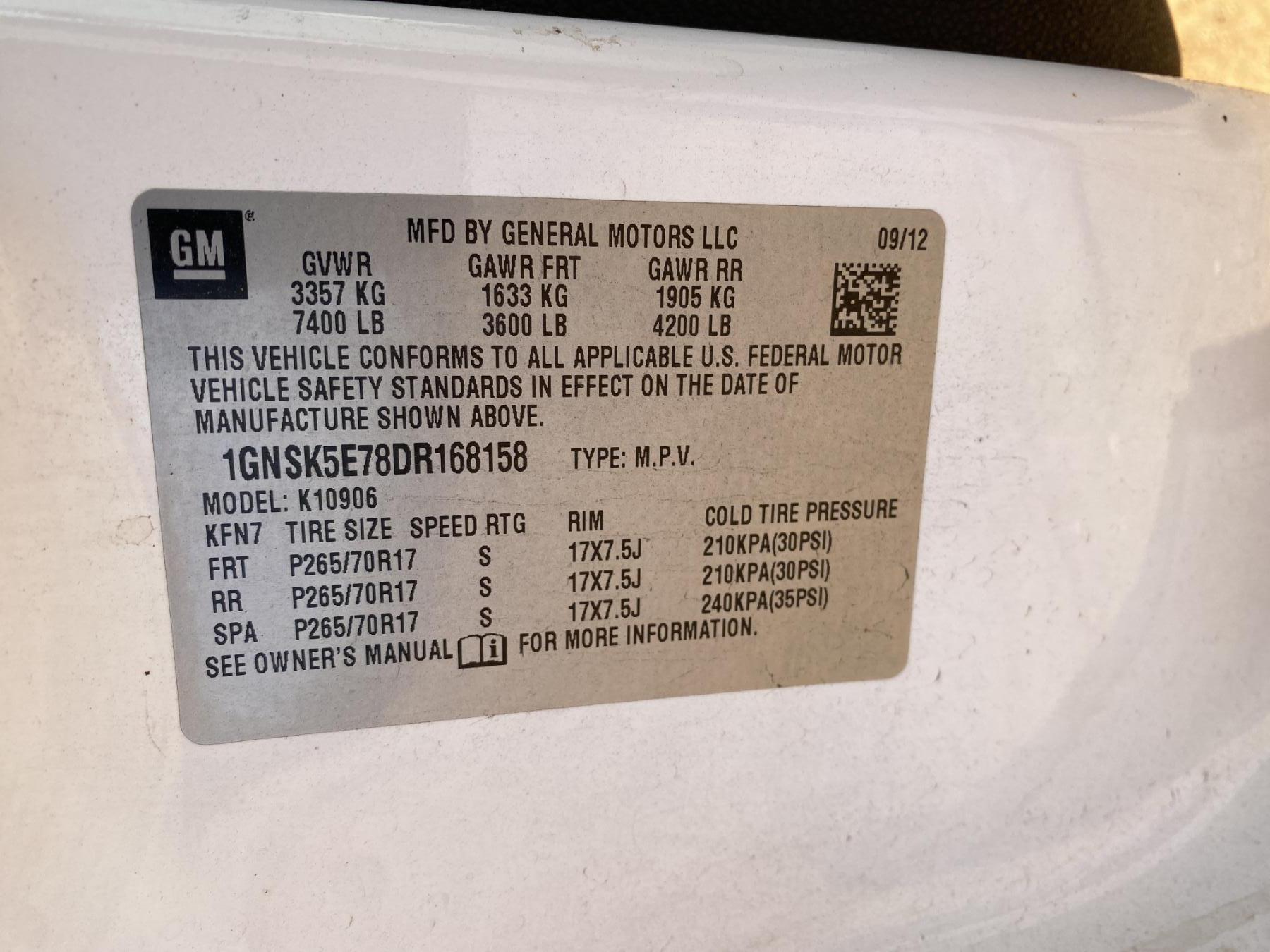 Vehicle ID Number: 1GNSK5E78DR168158