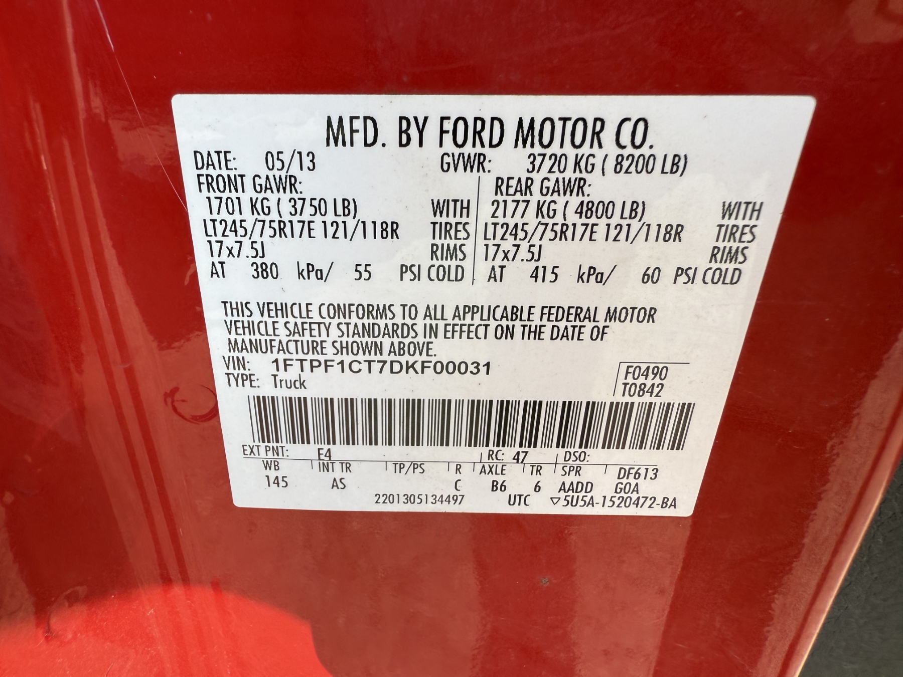 Vehicle ID Number: 1FTPF1CT7DKF00031