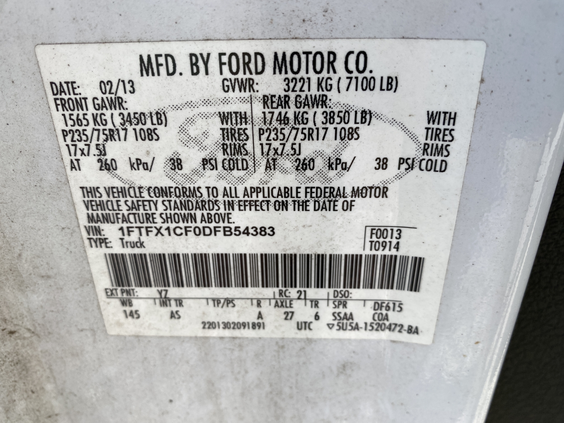 Vehicle ID Number: 1FTFX1CF0DFB54383