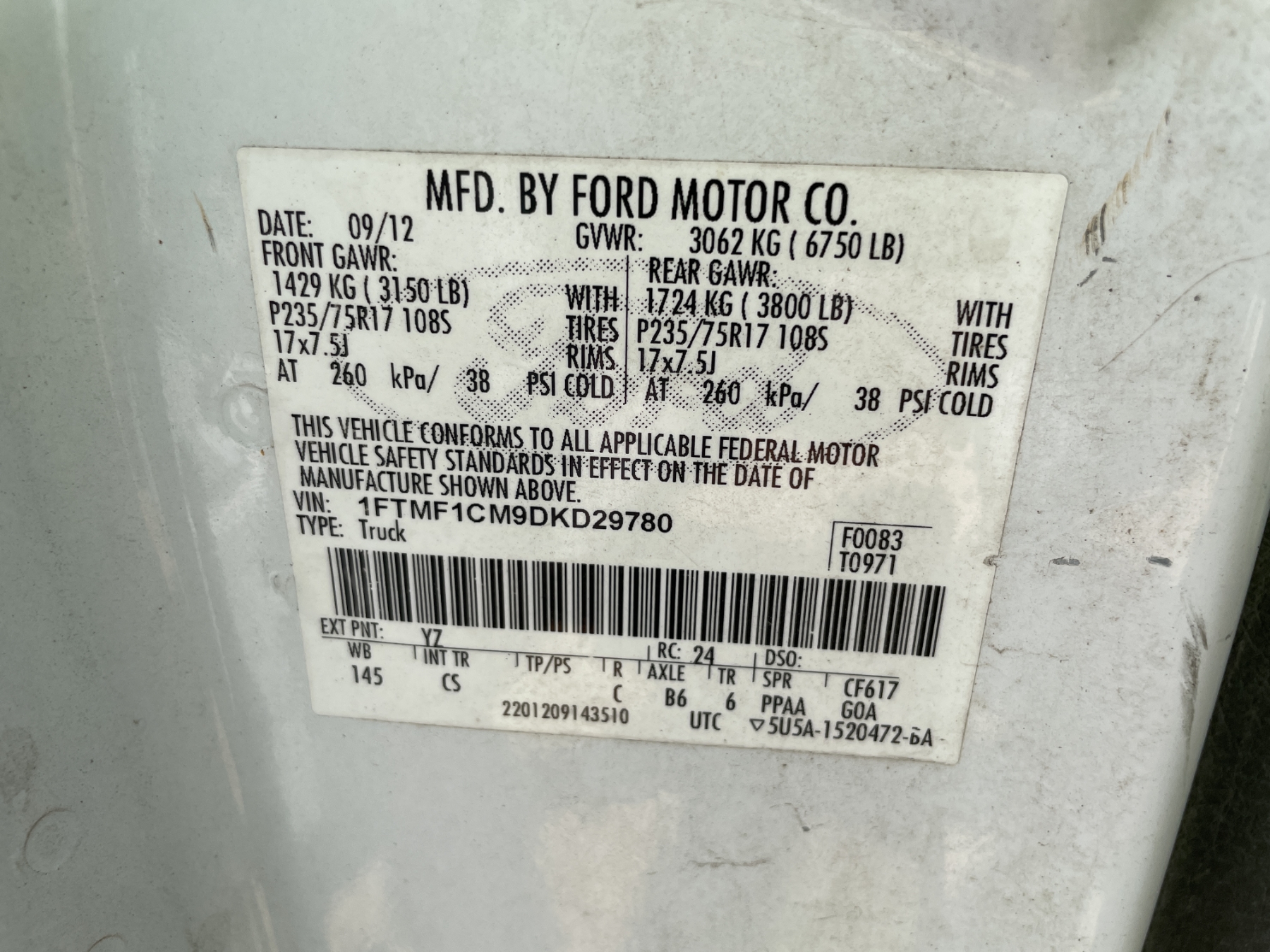 Vehicle ID Number: 1FTMF1CM9DKD29780