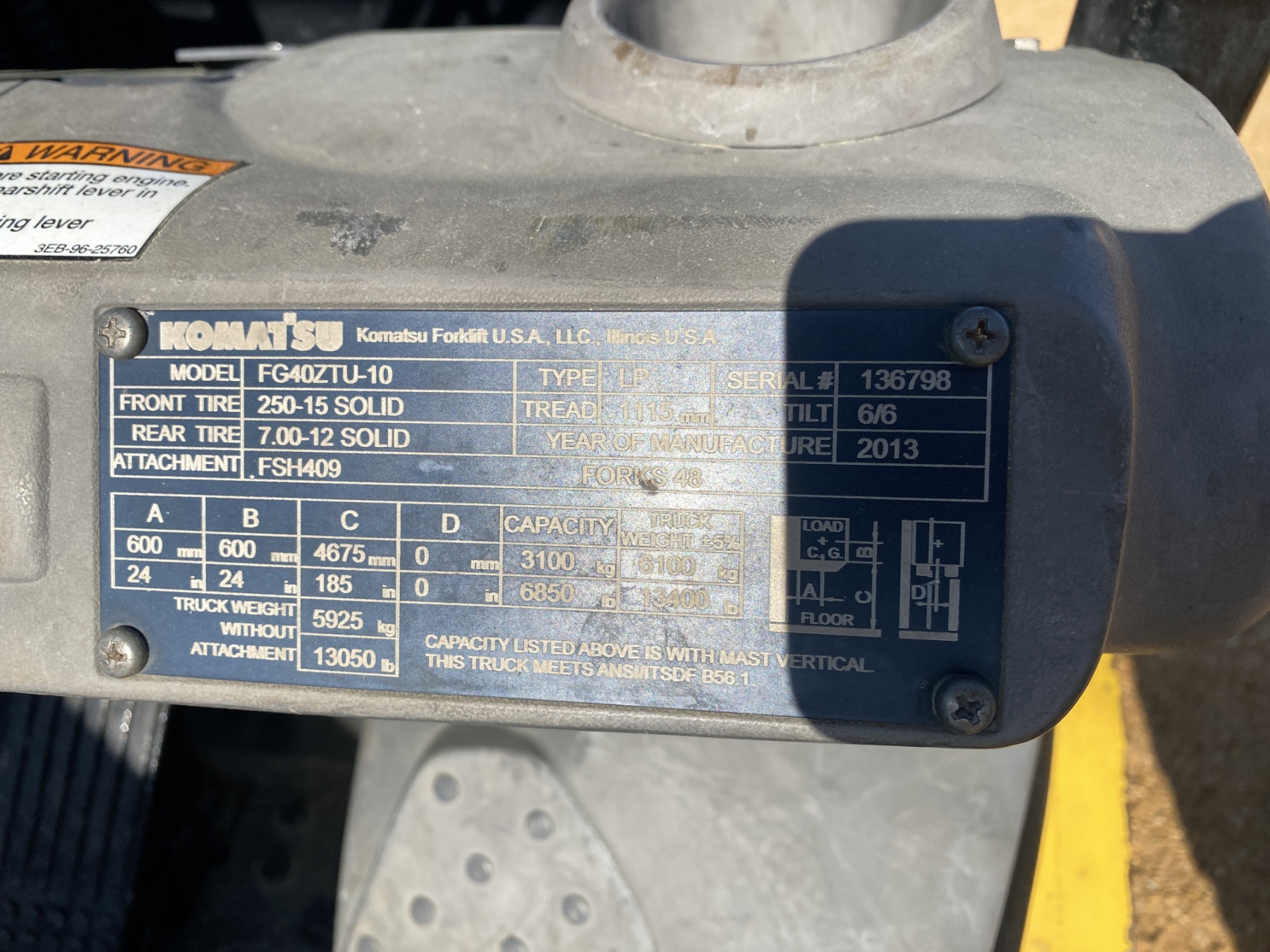 6,850 lb. capacity, 185" triple stage mast, LP gas, canopy
