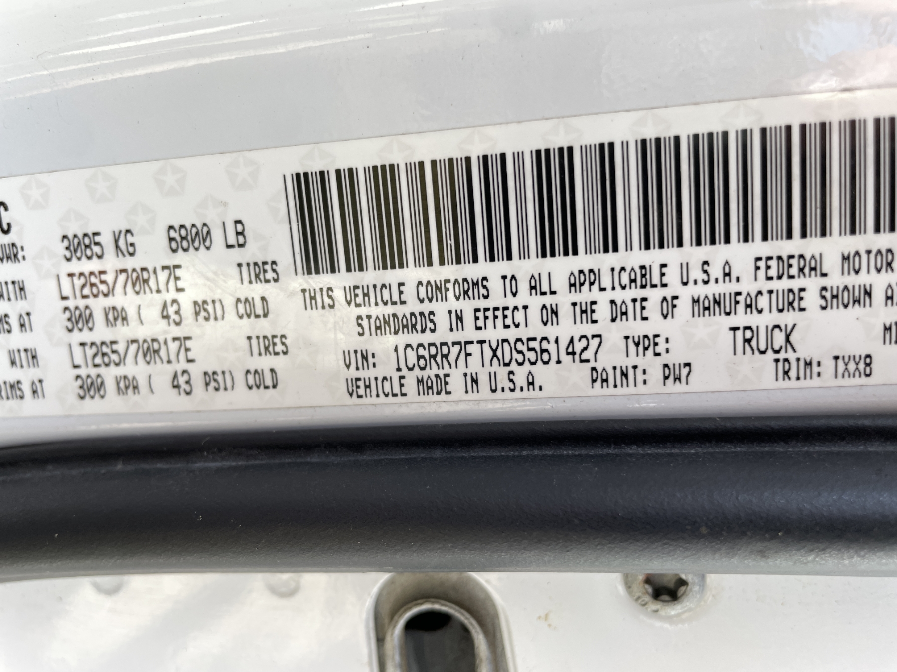 Vehicle ID Number: 1C6RR7FTXDS561427