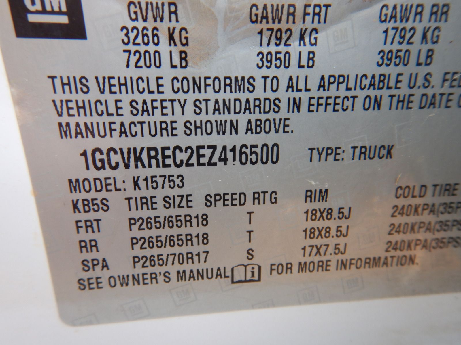 Vehicle ID Number: 1GCVKREC2EZ416500