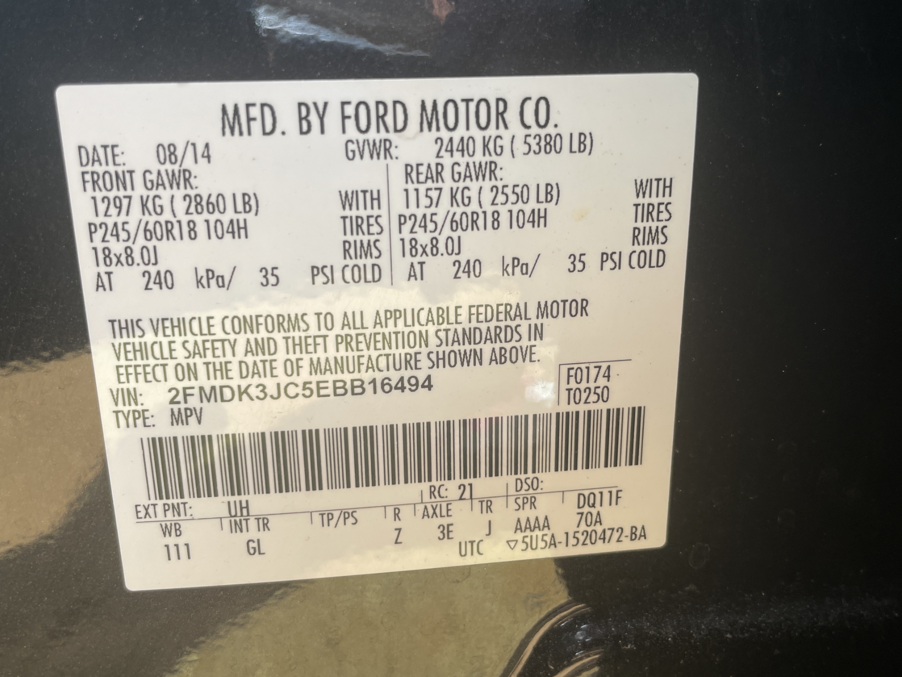 Vehicle ID Number: 2FMDK3JC5EBB16494