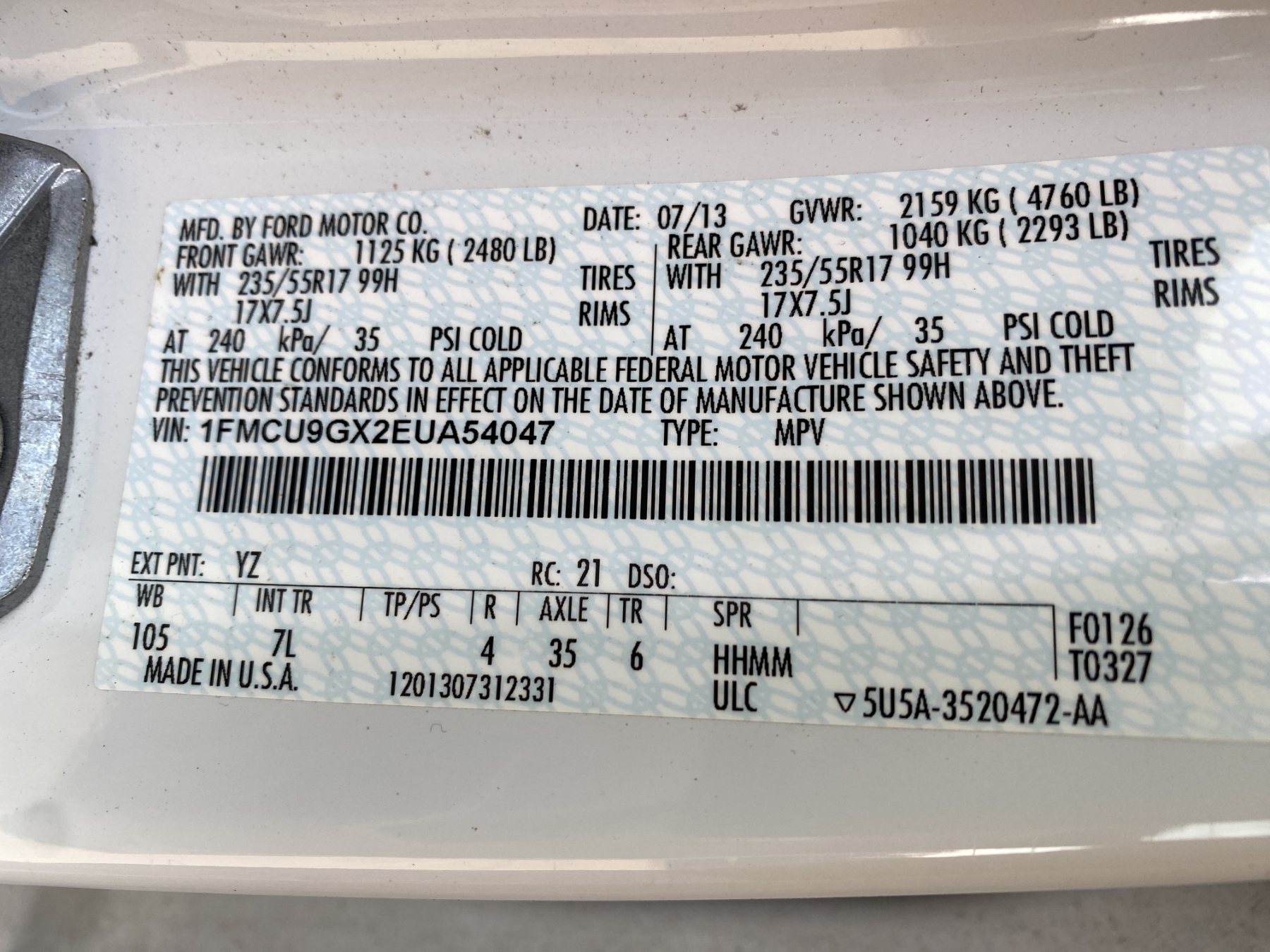 Vehicle ID Number: 1FMCU9GX2EUA54047