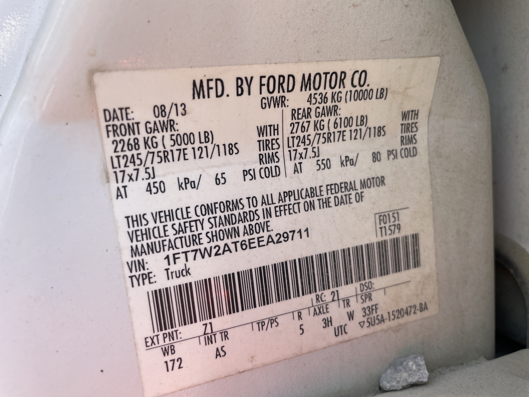 Vehicle ID Number: 1FT7W2AT6EEA29711