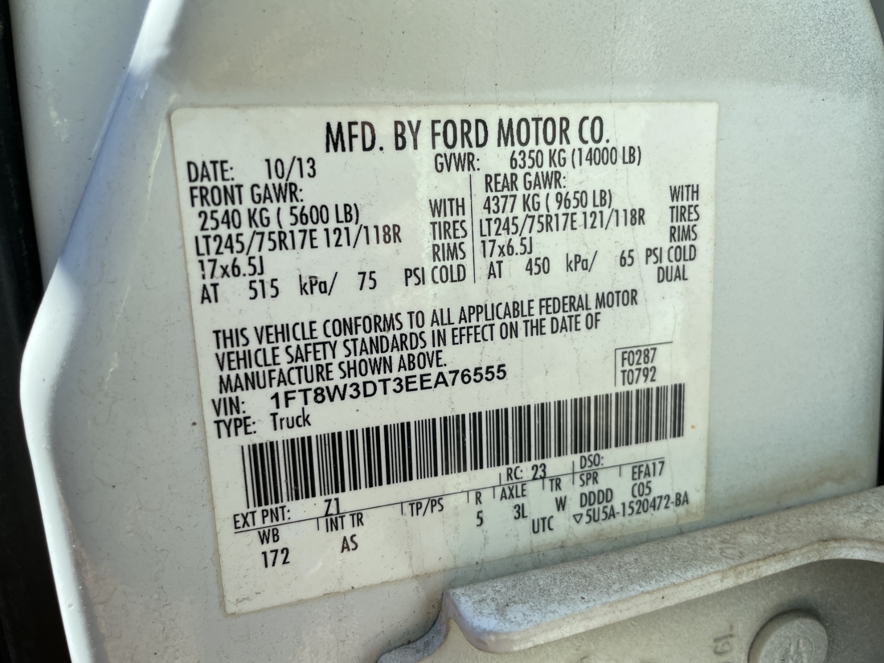 Vehicle ID Number: 1FT8W3DT3EEA76555