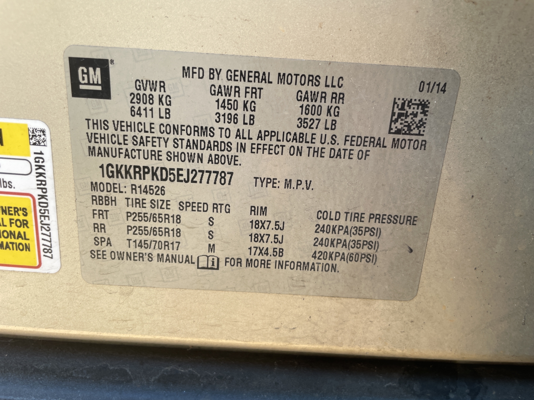 Vehicle ID Number: 1GKKRPKDEJ277787