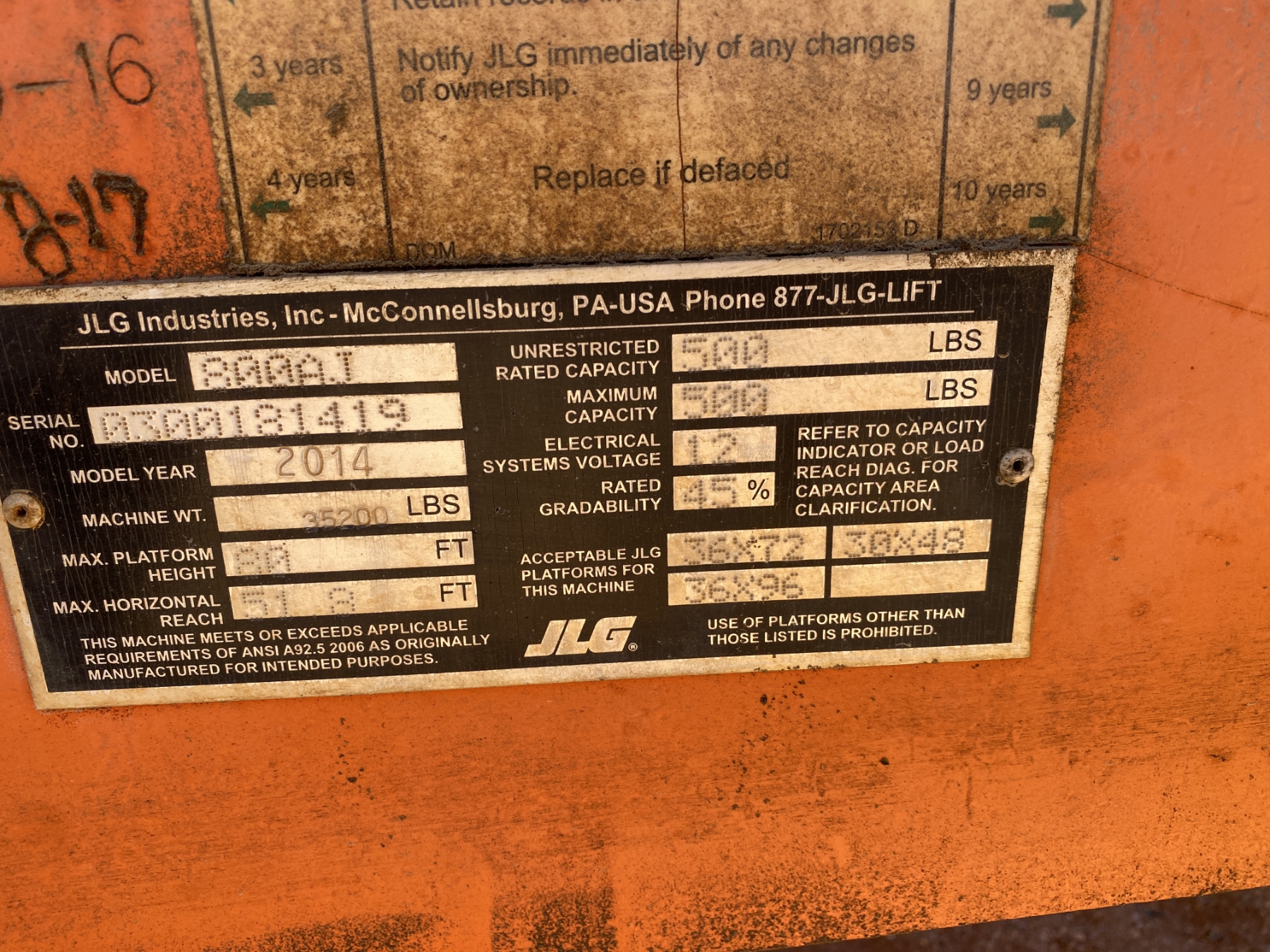 80' platform height, 500 lb. capacity