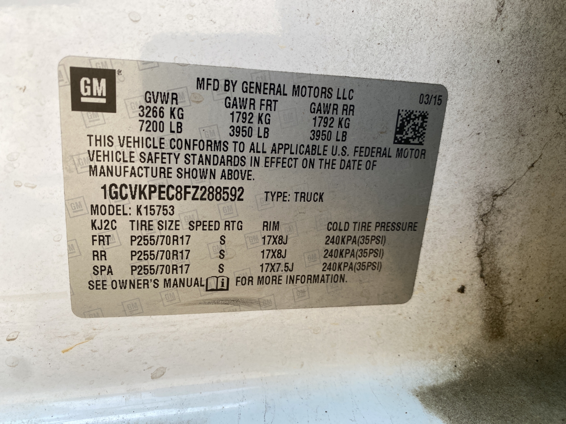 Vehicle ID Number: 1GCVKPEC8FZ288592