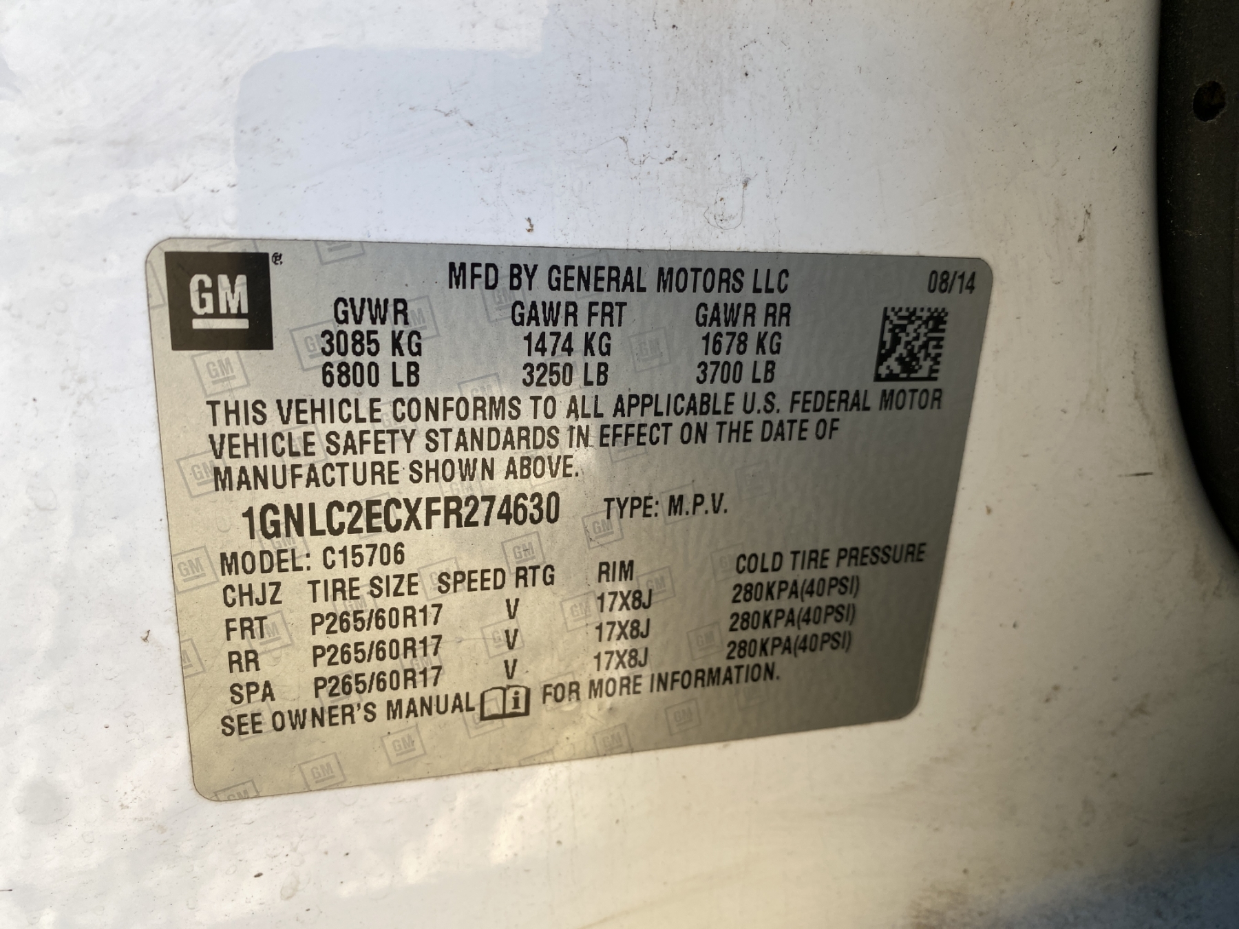 Vehicle ID Number: 1GNLC2ECXFR274630