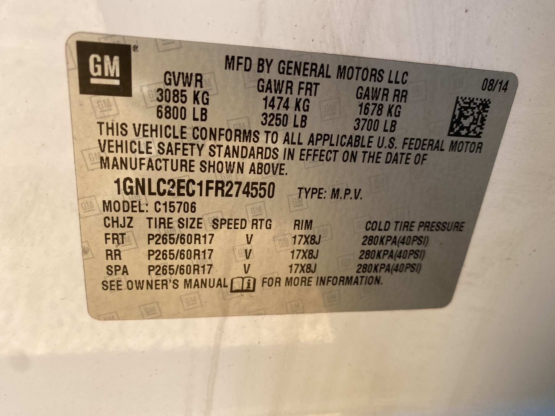 Vehicle ID Number: 1GNLC2EC1FR274550