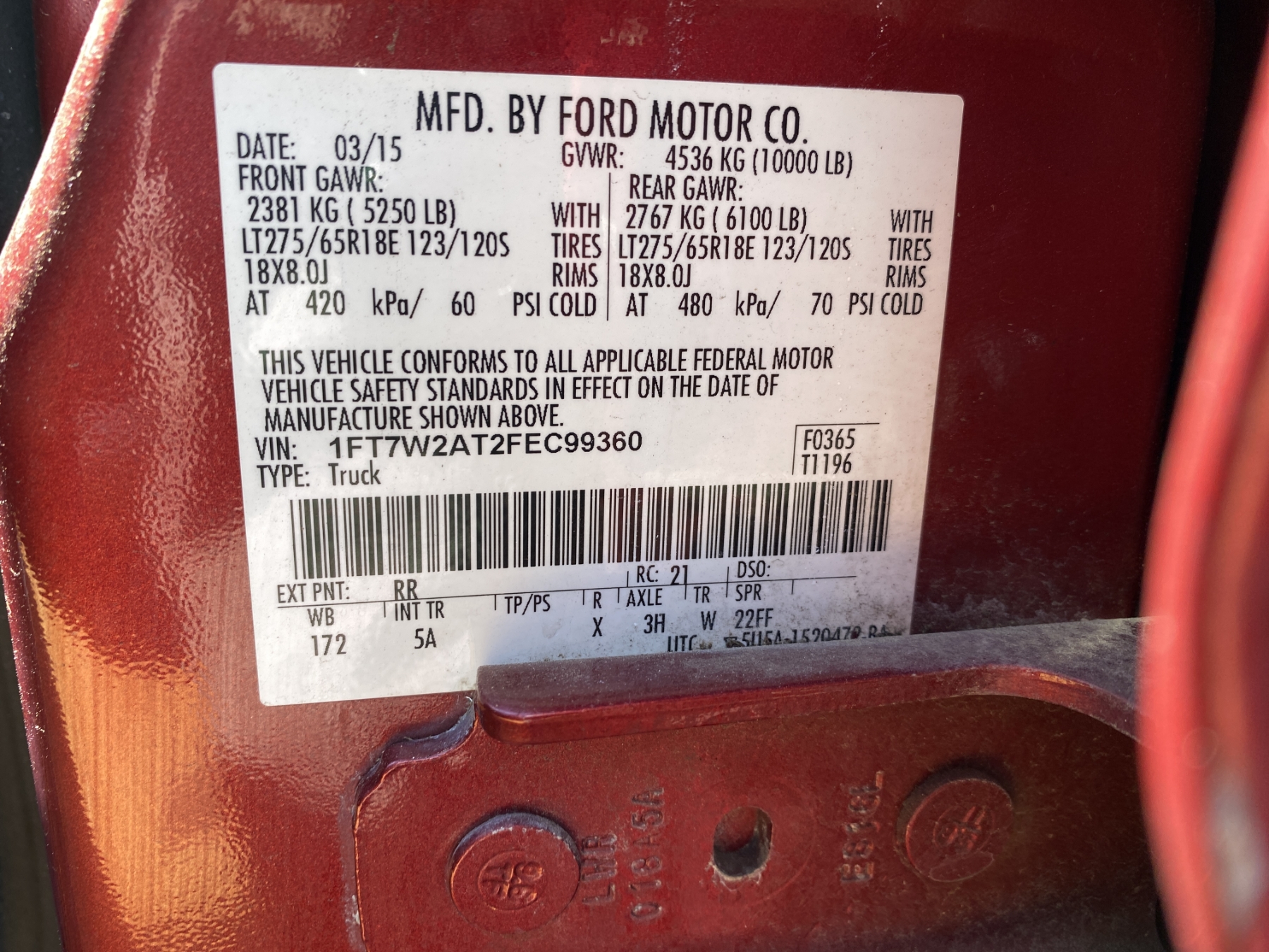Vehicle ID Number: 1FT7W2AT2FEC99360