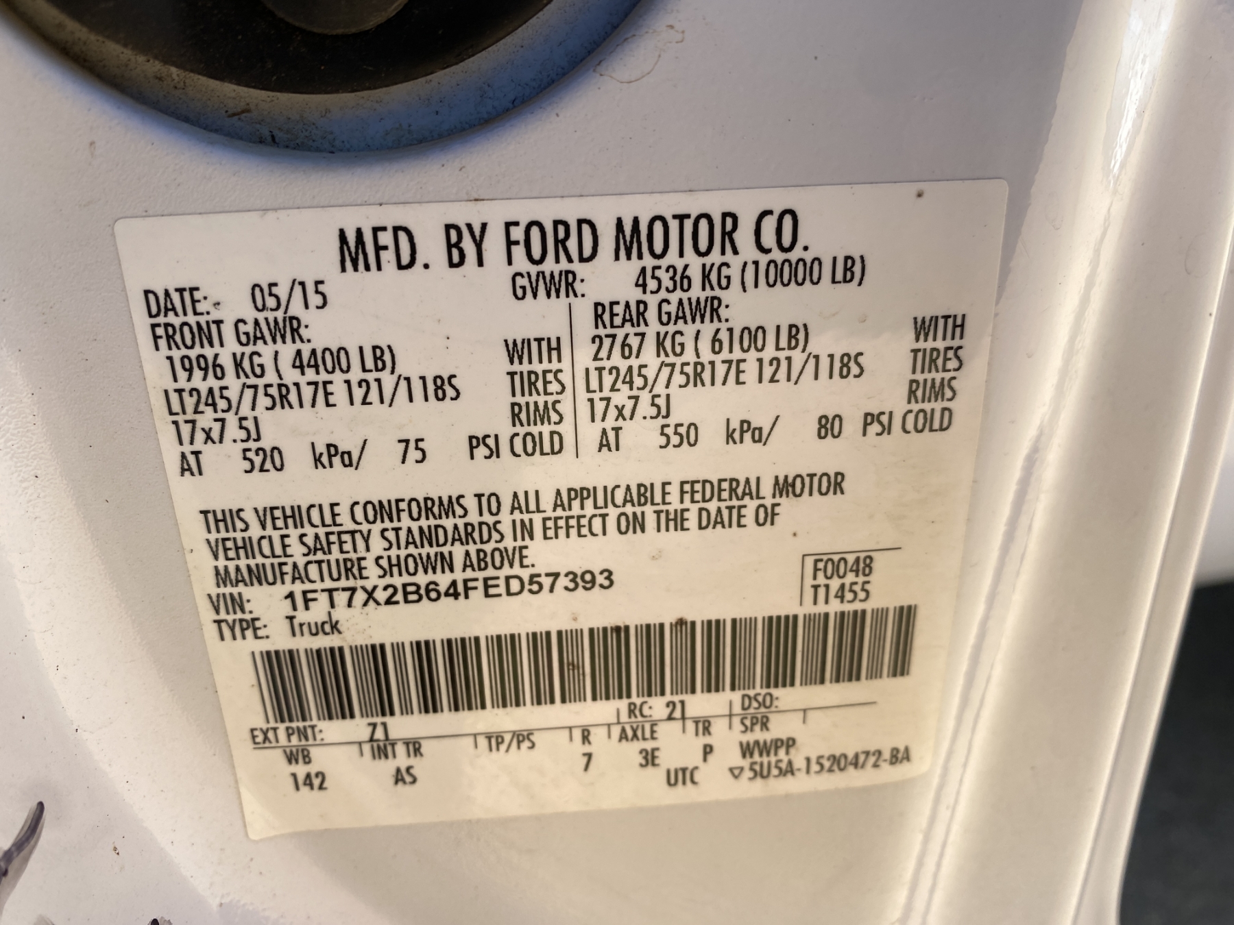 Vehicle ID Number: 1FT7X2B64FED57393