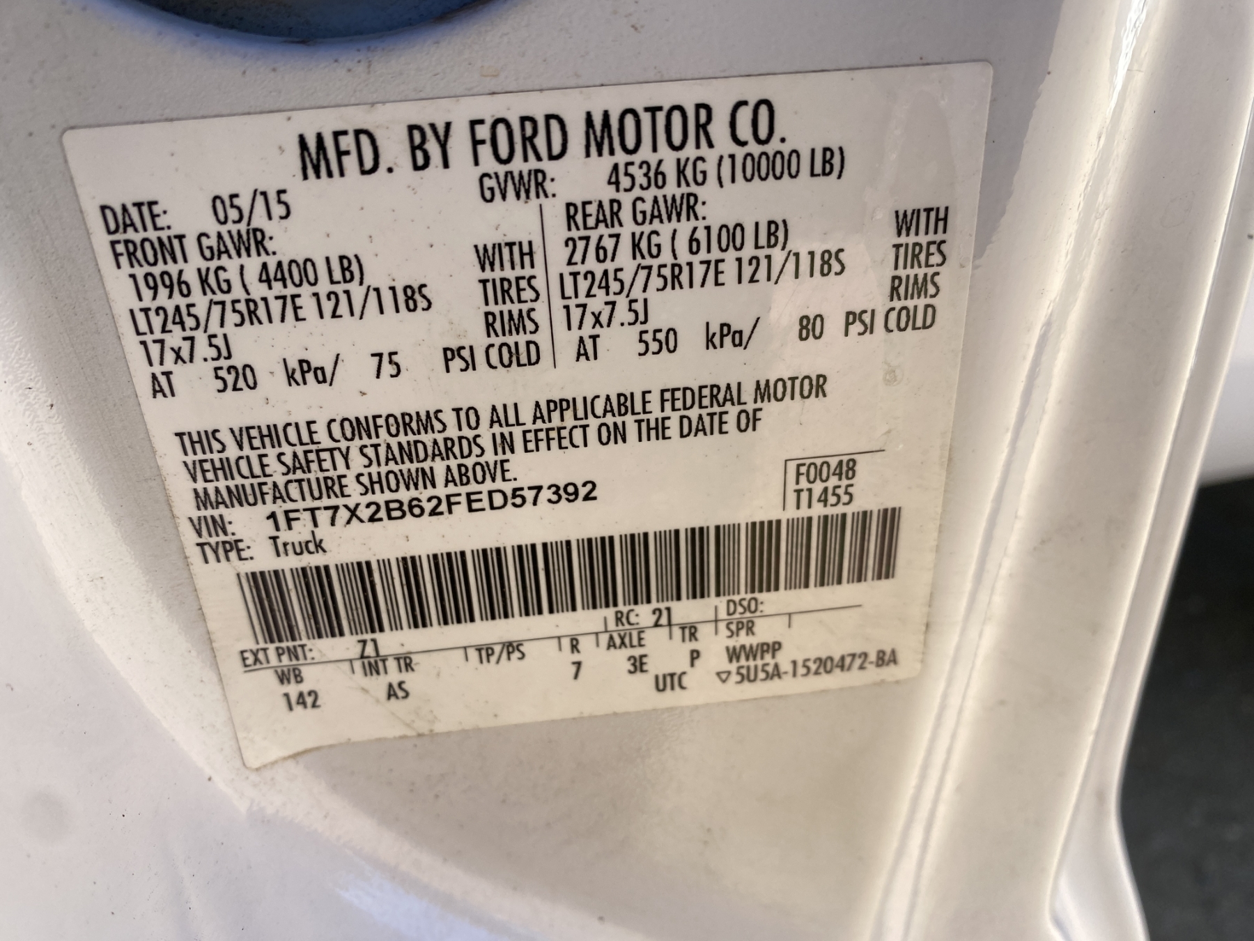 Vehicle ID Number: 1FT7X2B62FED57392