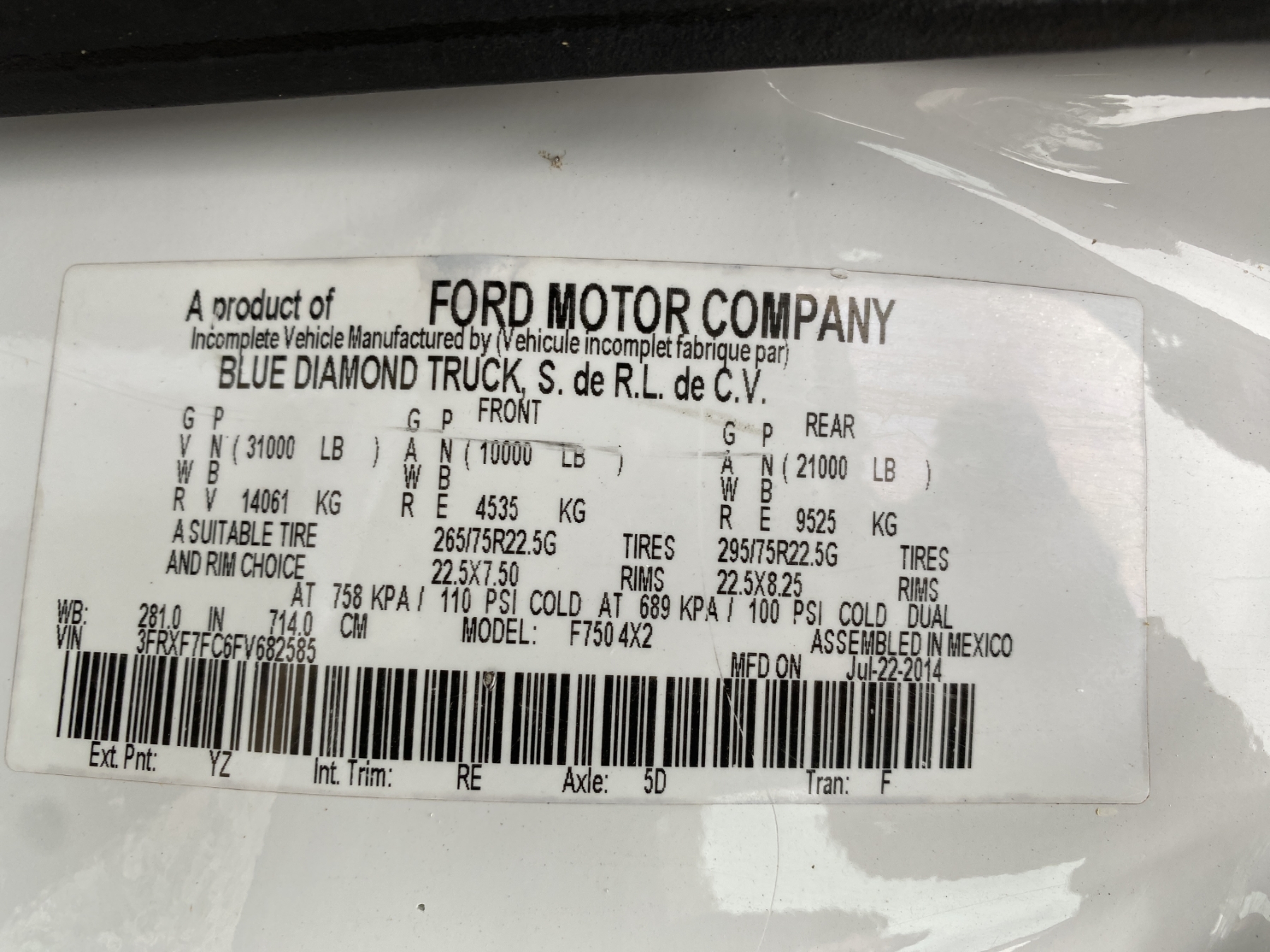Vehicle ID Number: 3FRXF7FC6FV682585