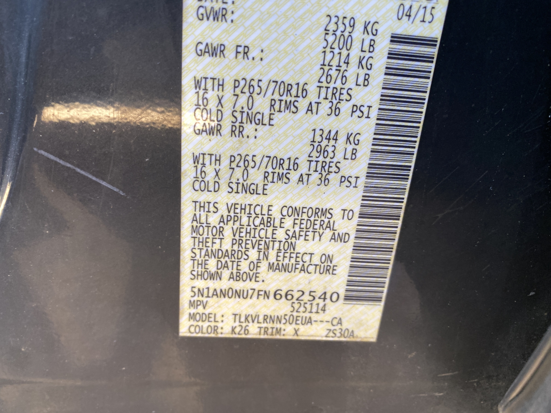 Vehicle ID Number: 5N1AN0NU7FN662540