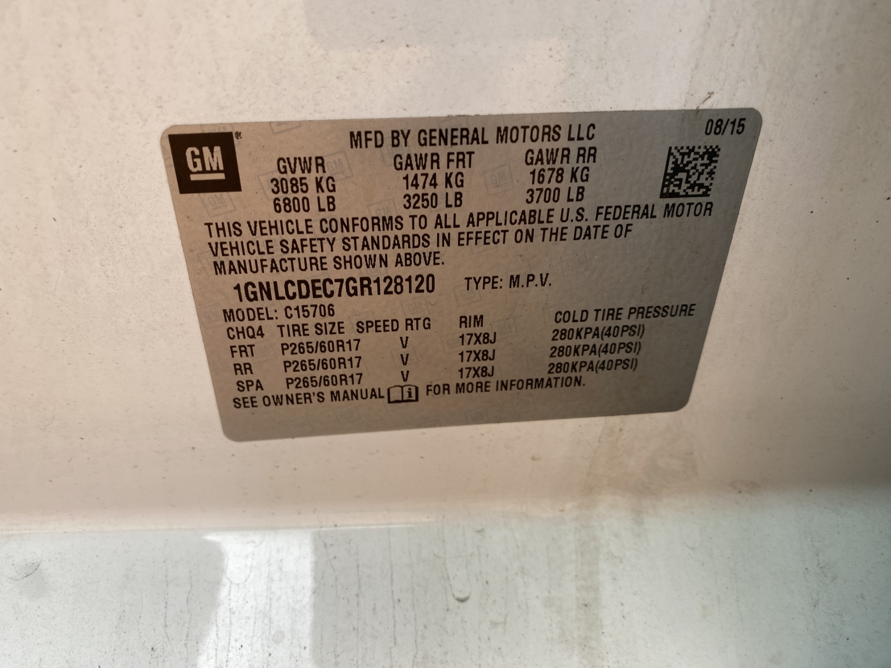Vehicle ID Number: 1GNLCDEC7GR128120