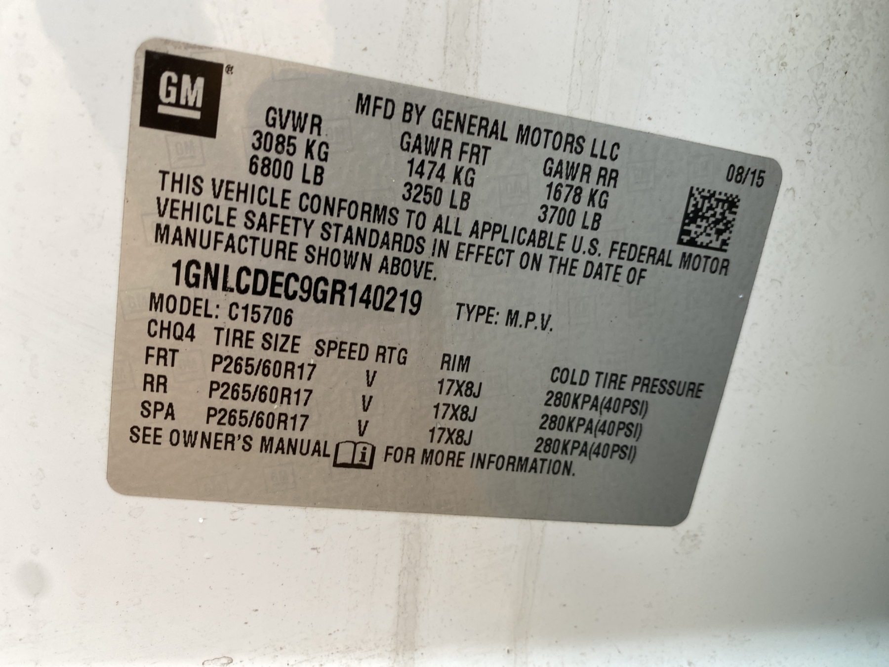 Vehicle ID Number: 1GNLCDEC9GR140219