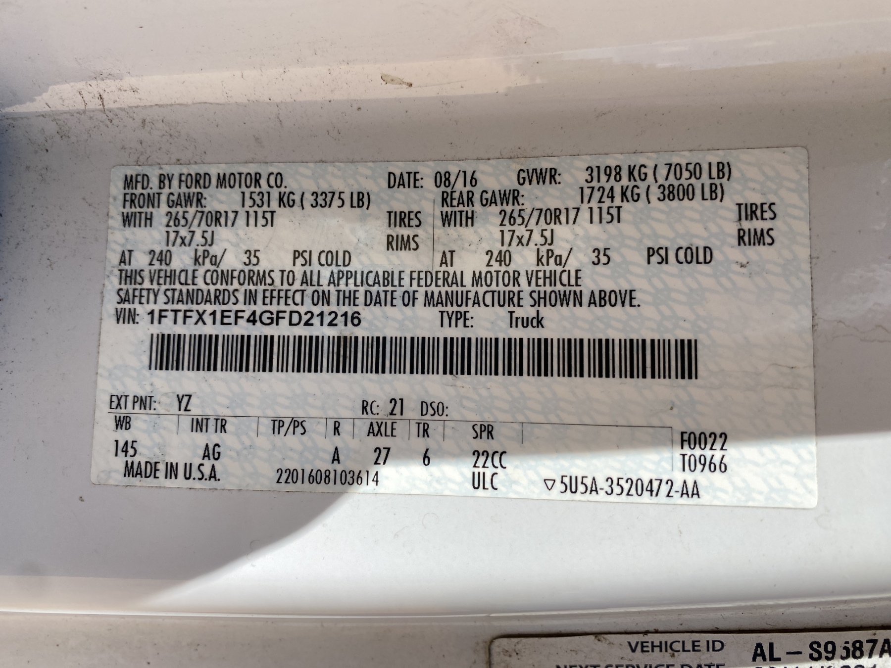Vehicle ID Number: 1FTFX1EF4GFD21216