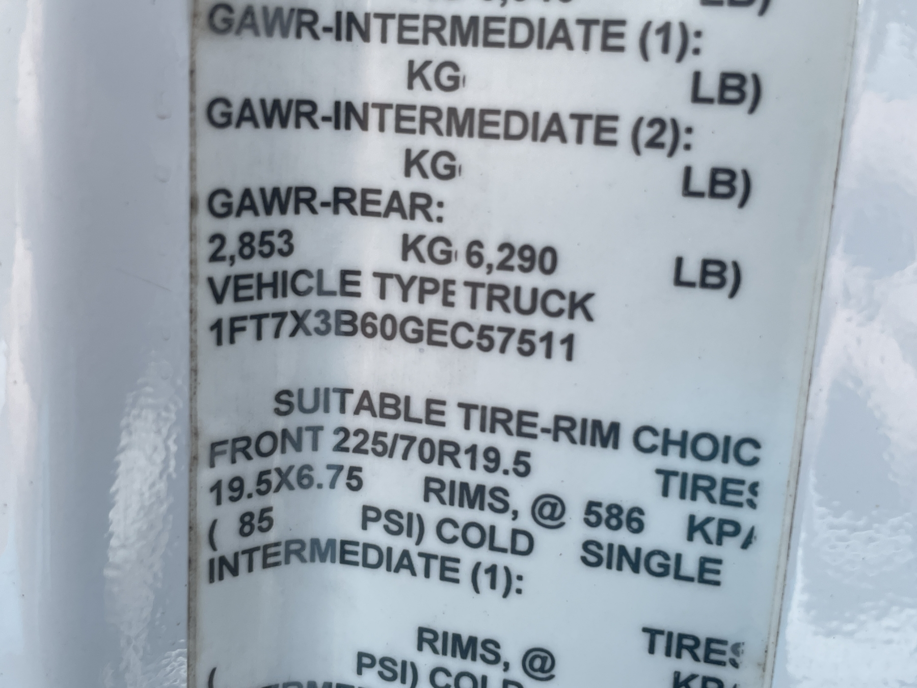 Vehicle ID Number: 1FT7X3B60GEC57511