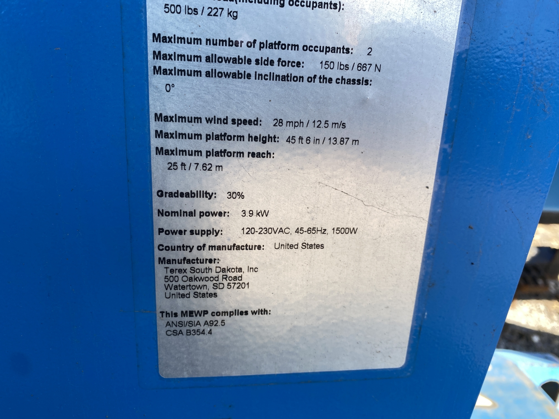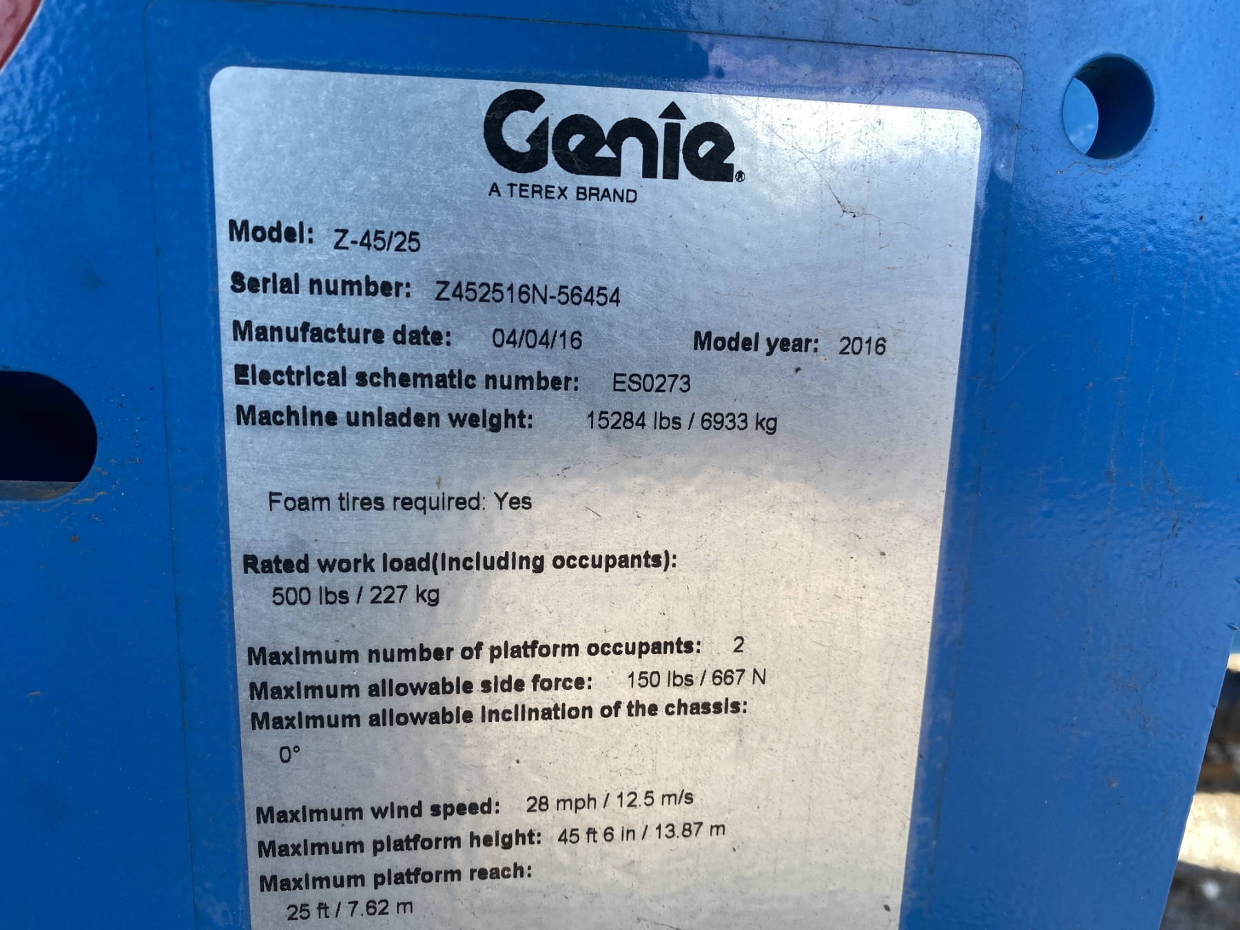45' platform height, 25' reach, 500 lb. capacity, electric