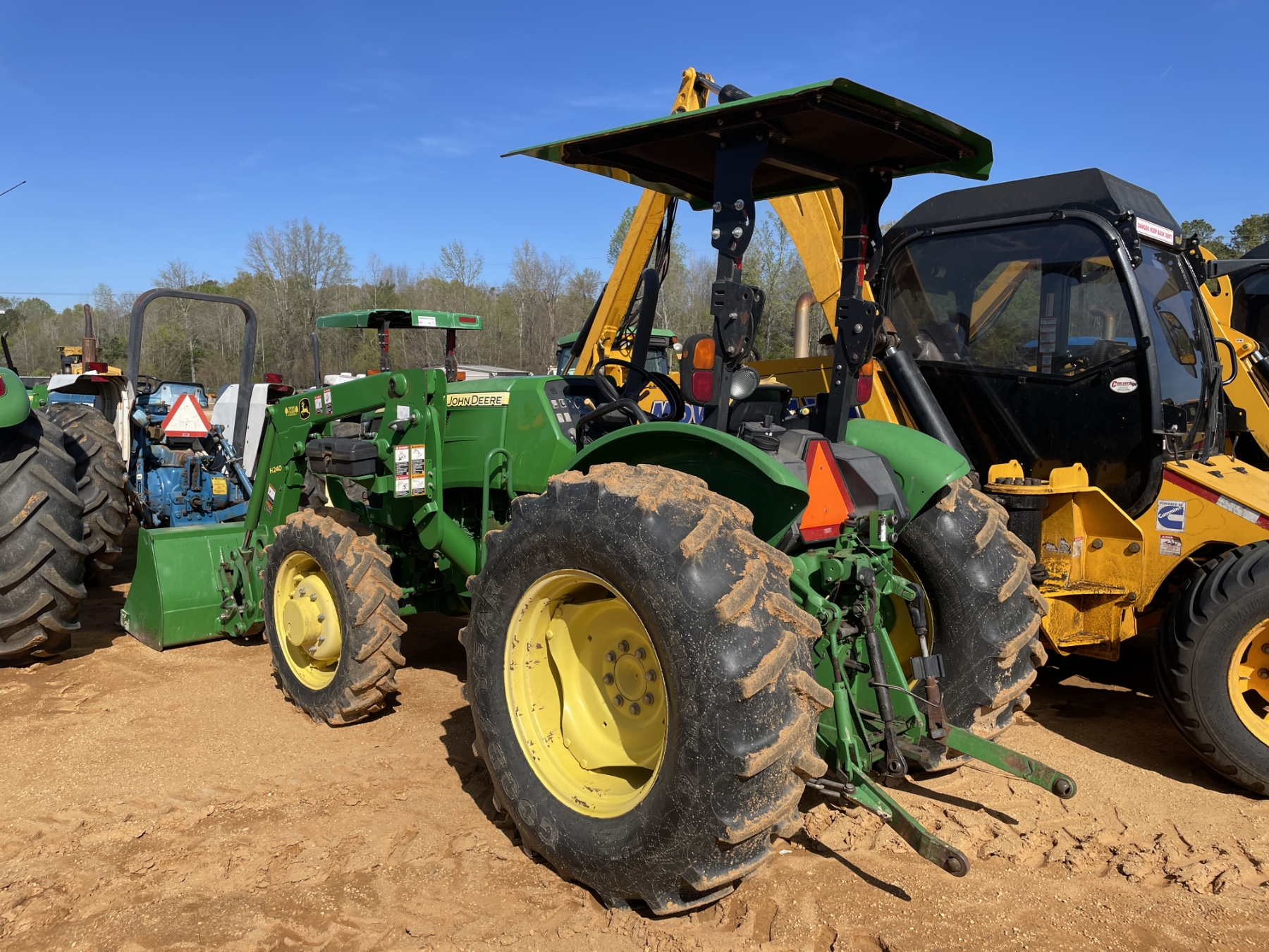 MFWD, (1) remote, John Deere H240 front loader attach, bucket, canopy, 16.9-28 rear tires, 9.5-24 front tires