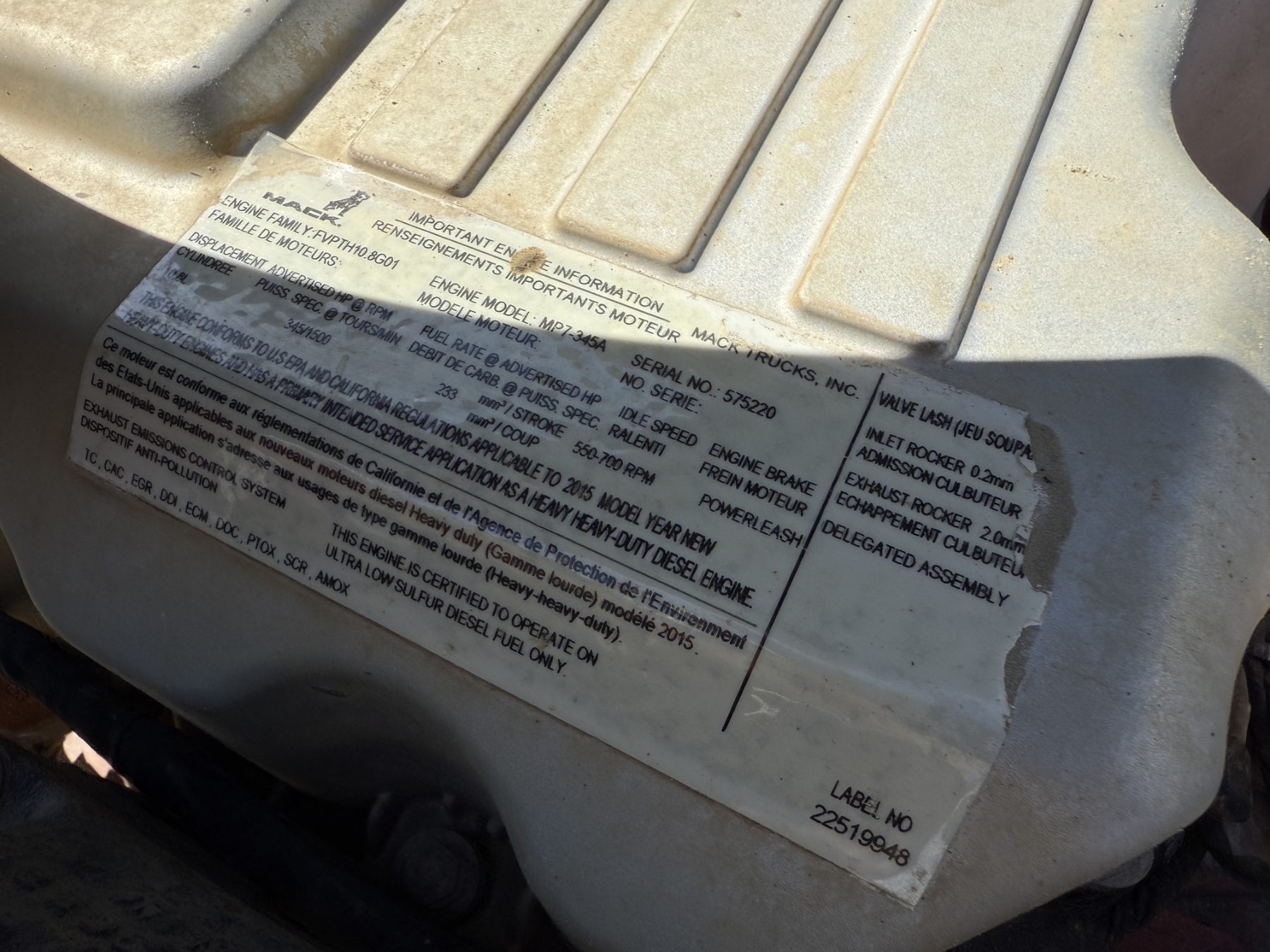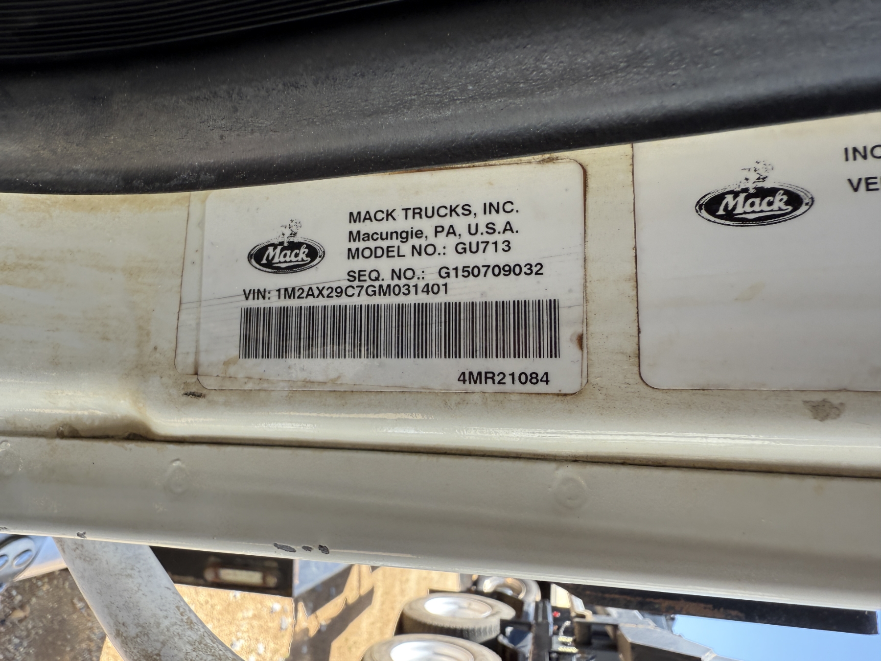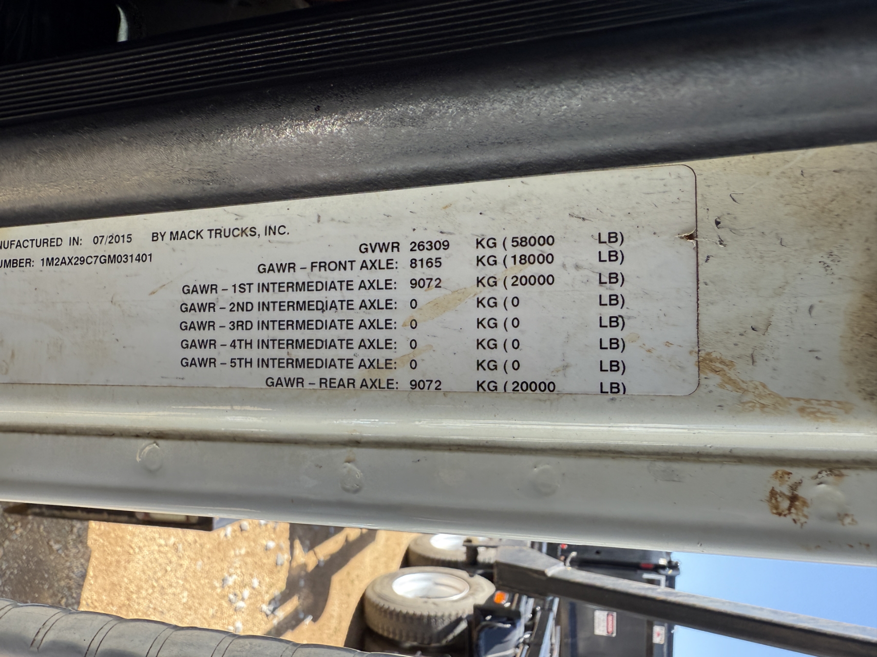 T/A, Mack MP7 engine, Allison A/T, 40K rears, 18K front, 60,000 lb. Galbreath hoist, 11R22.5 rear tires, 315/80R22.5 front tires